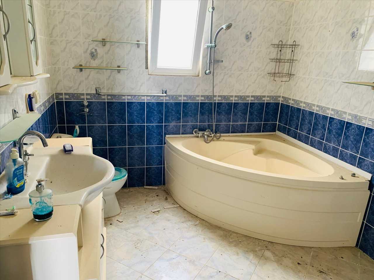 Single aspect with ceramic floor and wall tiles, washbasin, corner bath, wc and washing machine
