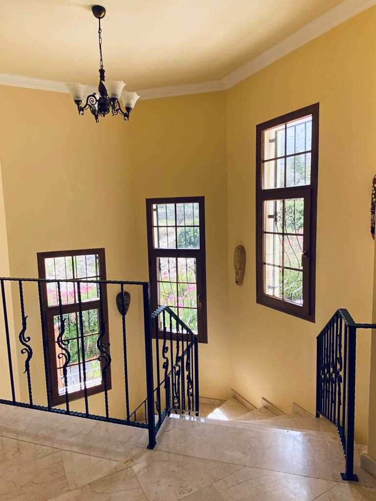 Triple aspect, marble floor with mosaic detail, coved ceiling, marble staircase, built in storage cupboard and door leading out to terrace and garden.