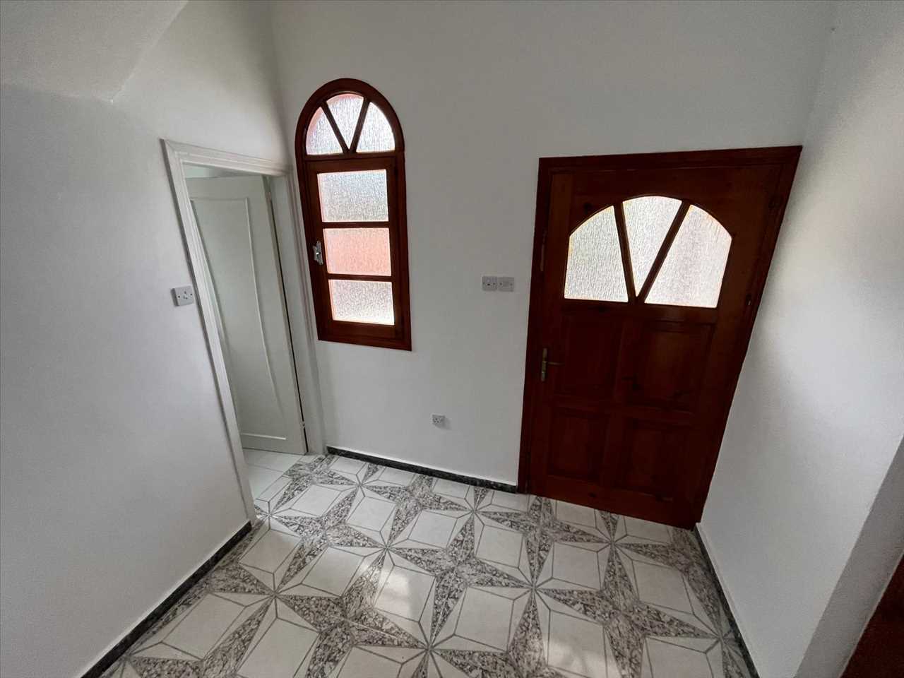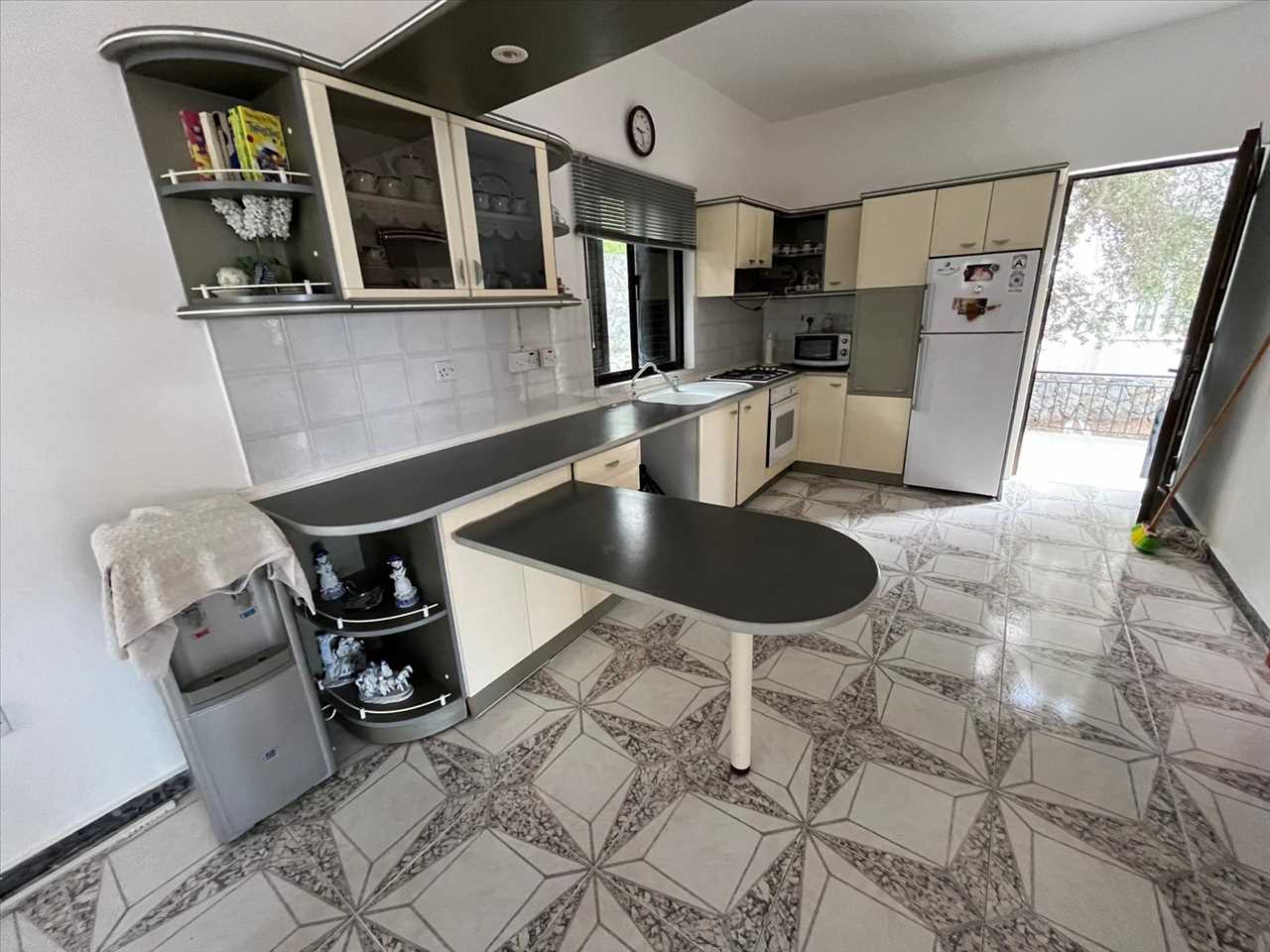 Dual aspect L shaped kitchen with fitted cupboards, breakfast bar, ceramic floors and a back door that leads out onto a spacious terrace at the back.
