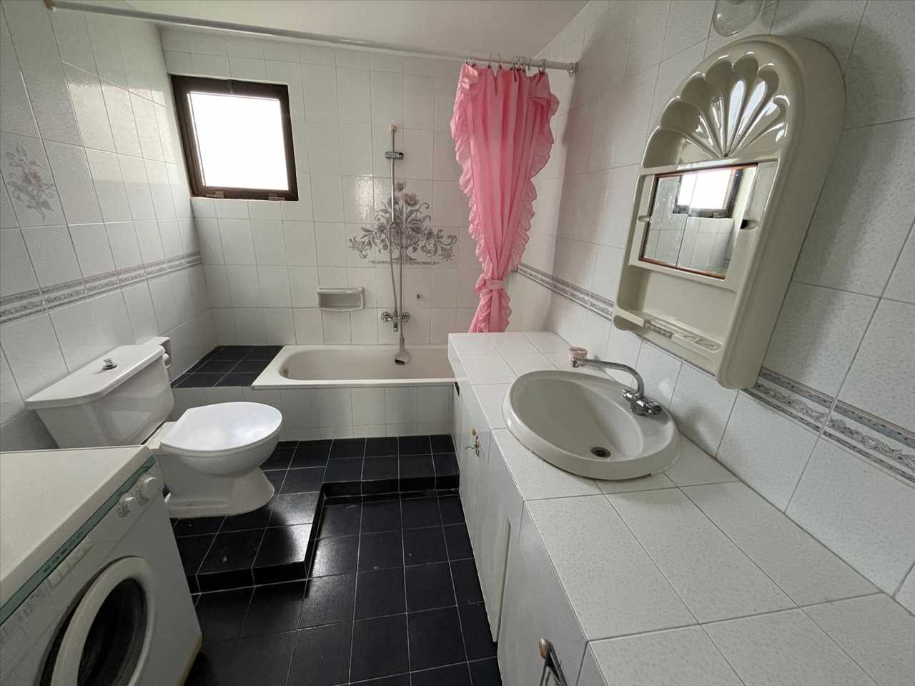 Single aspect bathroom with ceramic tiles, bath tub, sink with vanity unit and toilet.