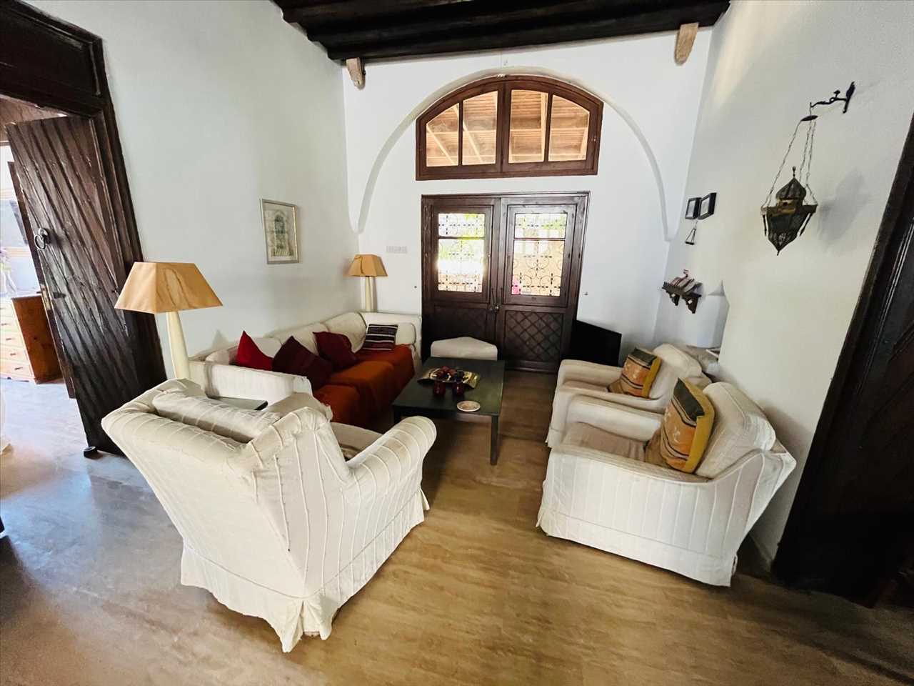 Single aspect lounge on the lower level with travertine floors, beamed ceilings and a separate front door.