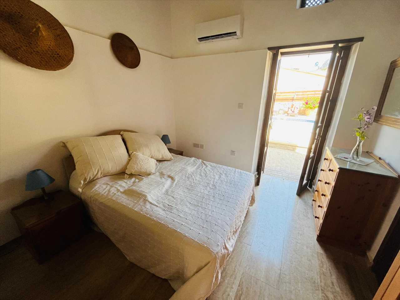 Dual aspect bedroom with travertine floors, air conditioning, beamed ceilings, an en suite bathroom and French doors leading out onto the pool area.