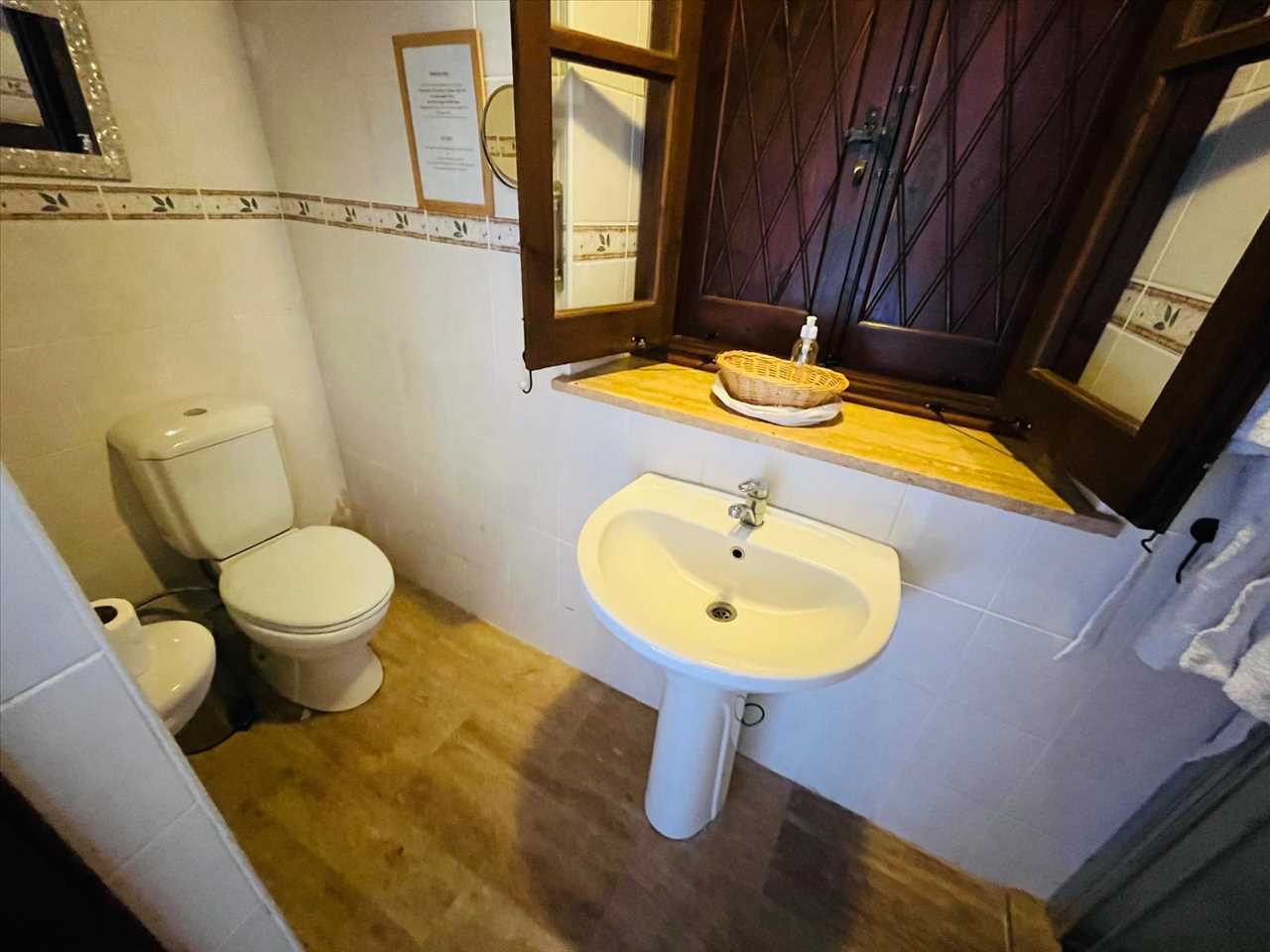 Single aspect bedroom with travertine floors, air conditioning, beamed ceilings, an en suite bathroom and French doors leading out onto the pool area.