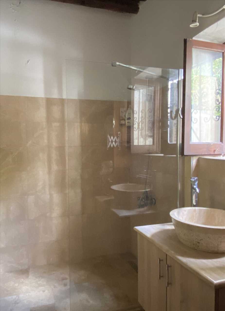 Single aspect, ceramic floor and wall tiles, beam and matt ceiling, marble washbasin in vanity unit and large walk-in shower with glass screen.