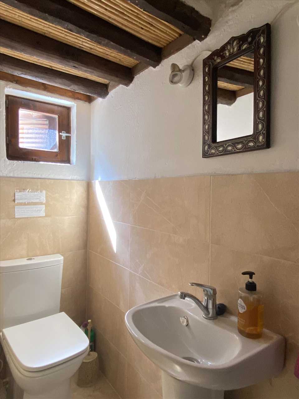 Single aspect, ceramic floor and wall tiles, beam and matt ceiling, washbasin and wc.