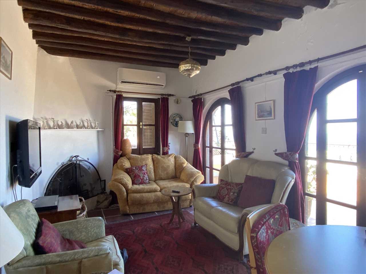 Open plan living area with dual aspect, ceramic floor, beam and matt ceiling, traditional open fireplace and 3 sets of arched French doors leading out to the terrace.