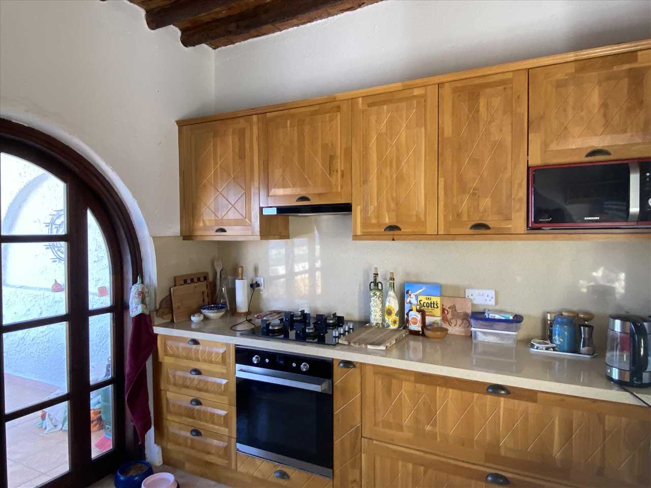 Single aspect, ceramic floor and wall tiles, beam and matt ceiling, Oak fitted kitchen with appliances and arched French doors to the terrace.
