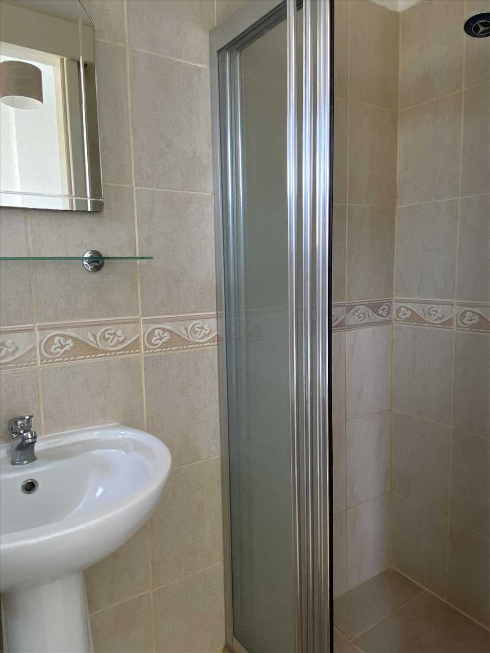 Single aspect, ceramic floor and wall tiles, wc, washbasin and shower with sliding screen.