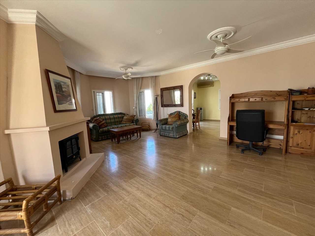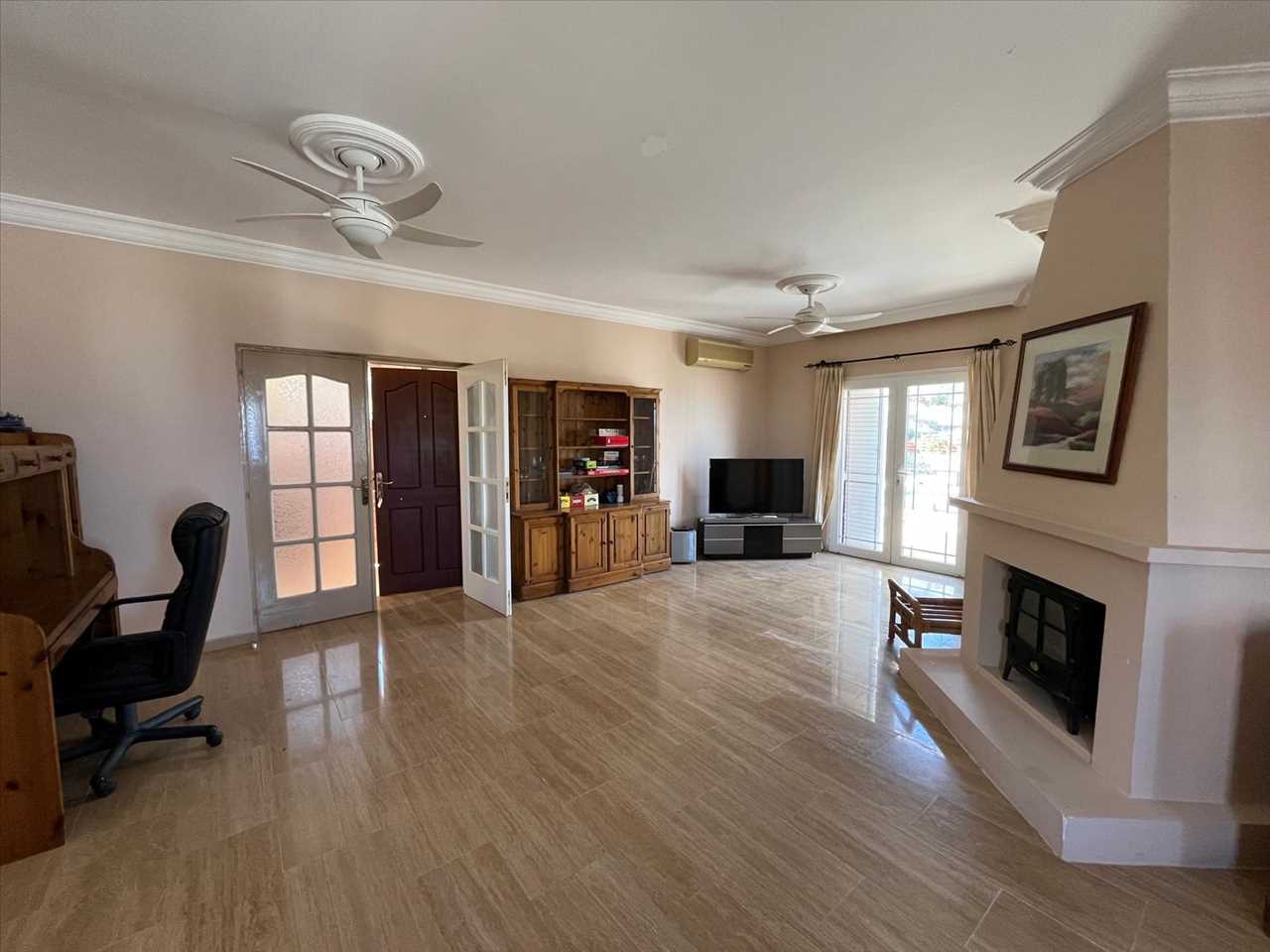 Spacious dual aspect lounge with travertine floors, log burner in fire place, ceiling fans, air conditioning and a wonderful terrace overlooking the pool area.
