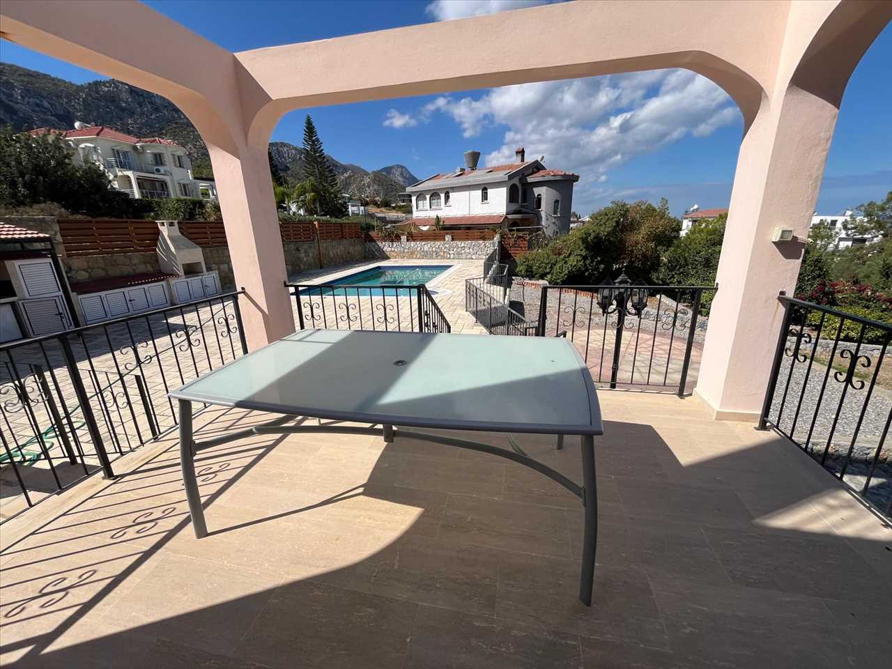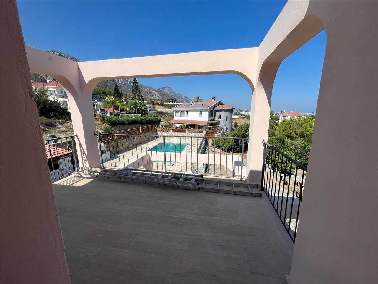 Spacious balcony overlooking the pool area with mountain views.