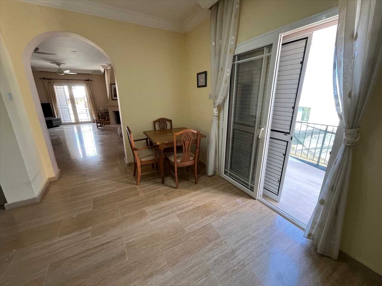 Spacious dining area with a balcony facing the sea and arched entrance to the lounge.