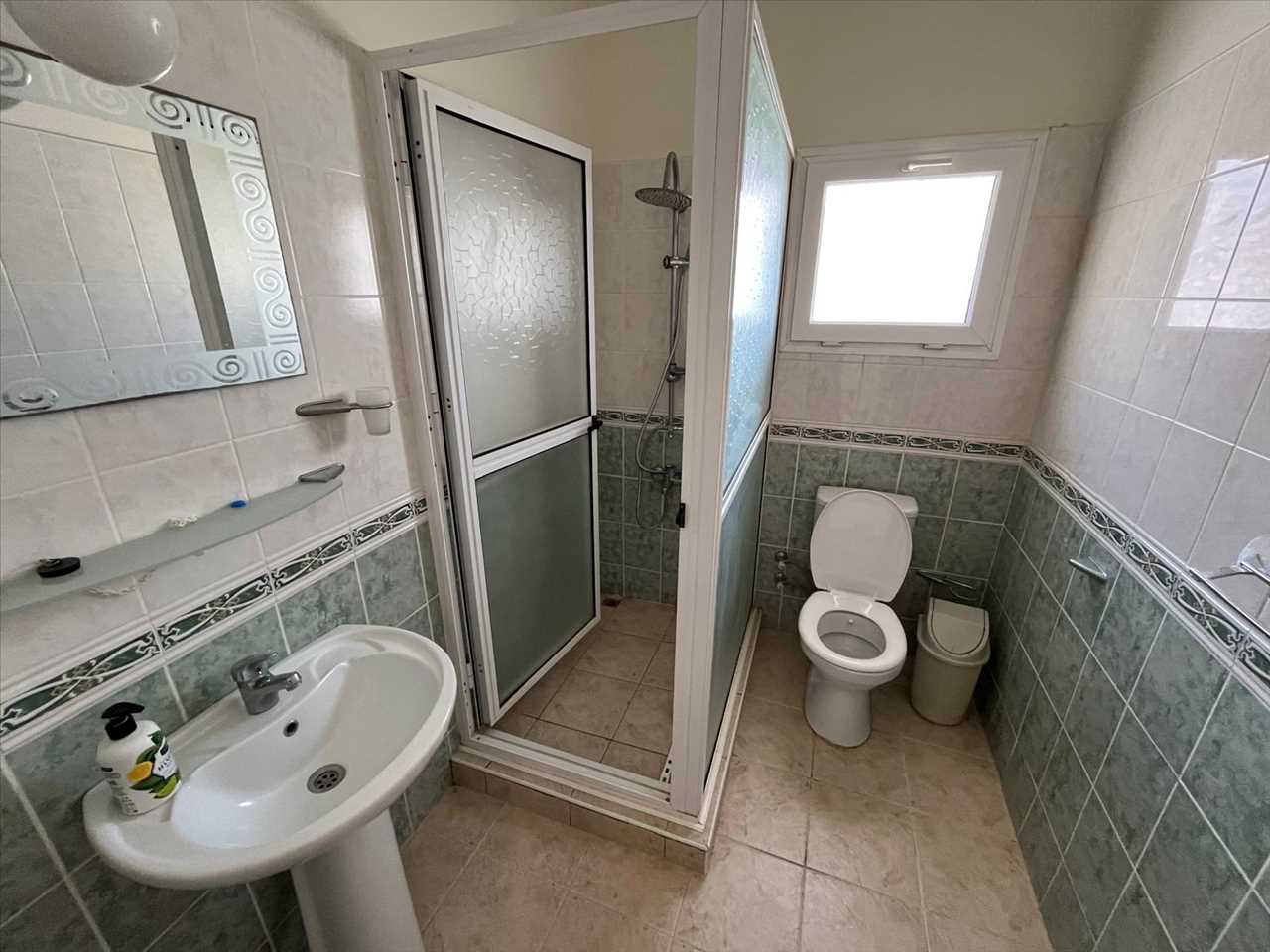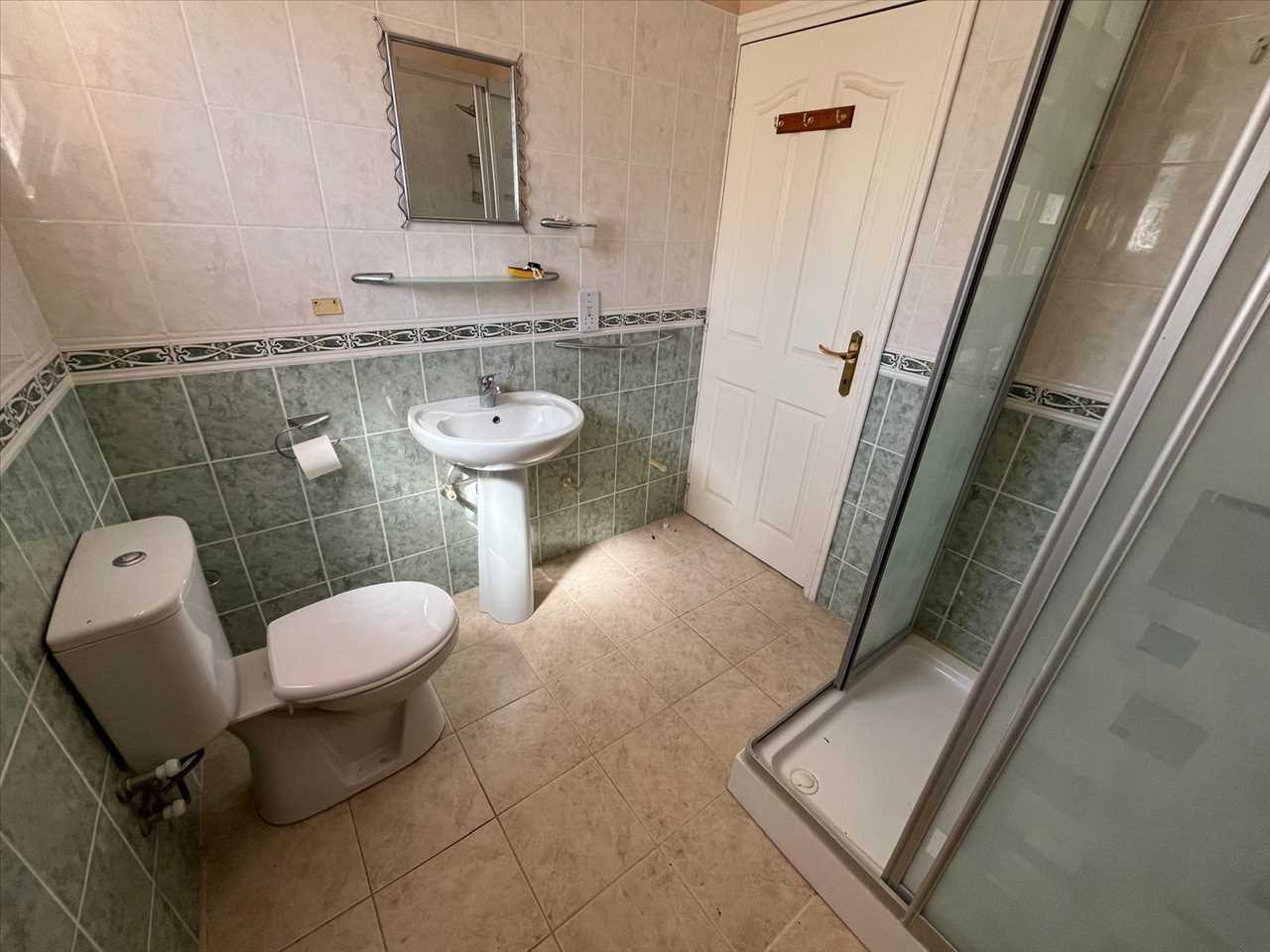 Single aspect with ceramic tiles, shower cabin, toilet and sink.