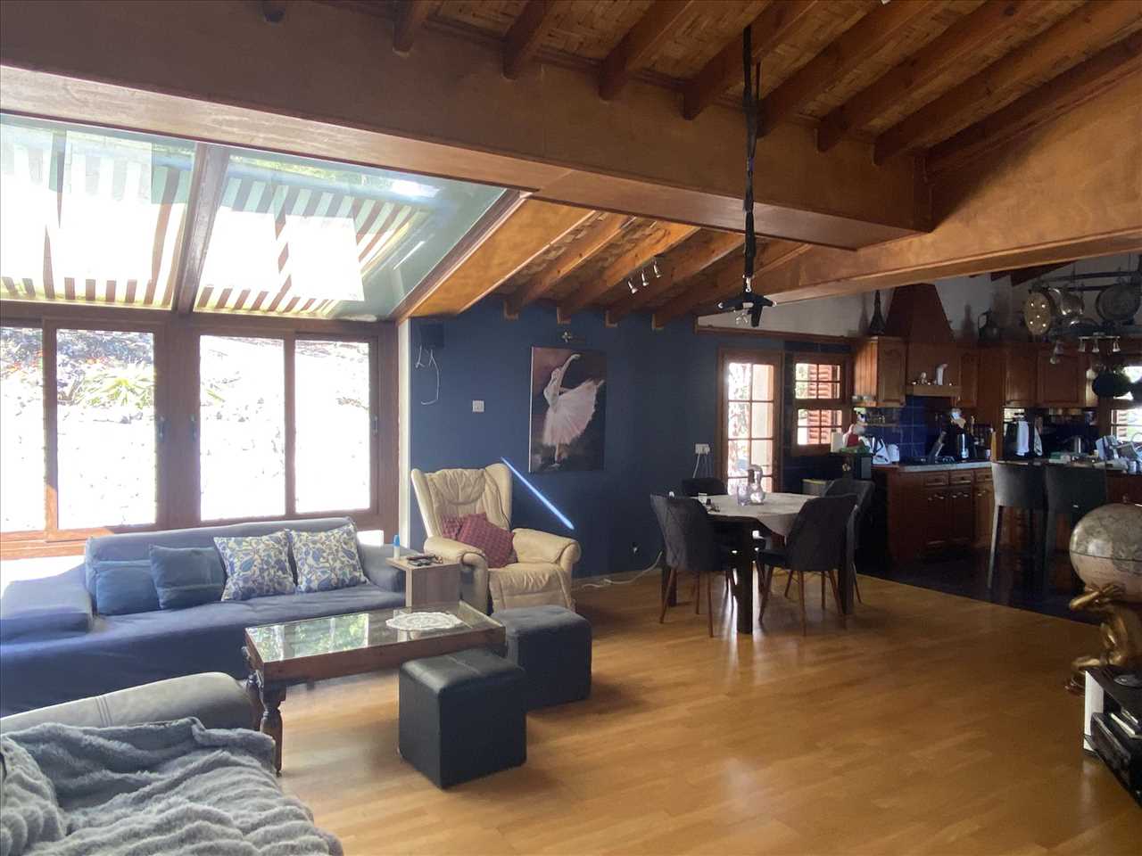 Superb open plan living area incorporating the lounge, kitchen and dining room with dual aspect, vaulted and beamed ceiling, air conditioning, multi fuel wood / pellet burning stove, ceiling fan, patio doors to terrace, parking area and garden.