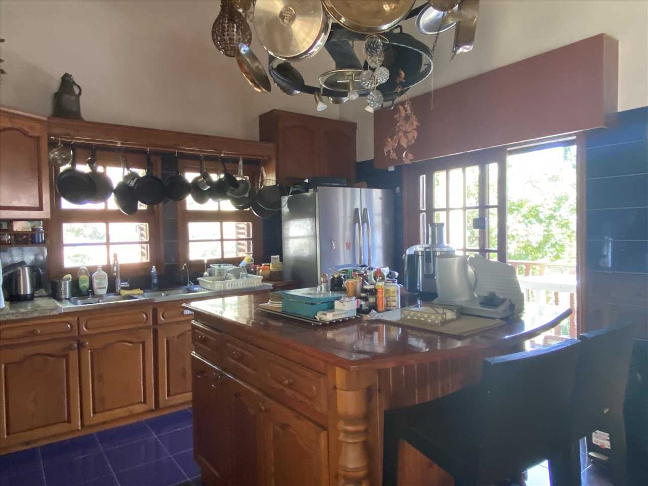 Triple aspect, ceramic floor and wall tiles, bespoke timber fitted kitchen with appliances and central isle. French doors lead out to covered dining terrace with a superb view to the sea.