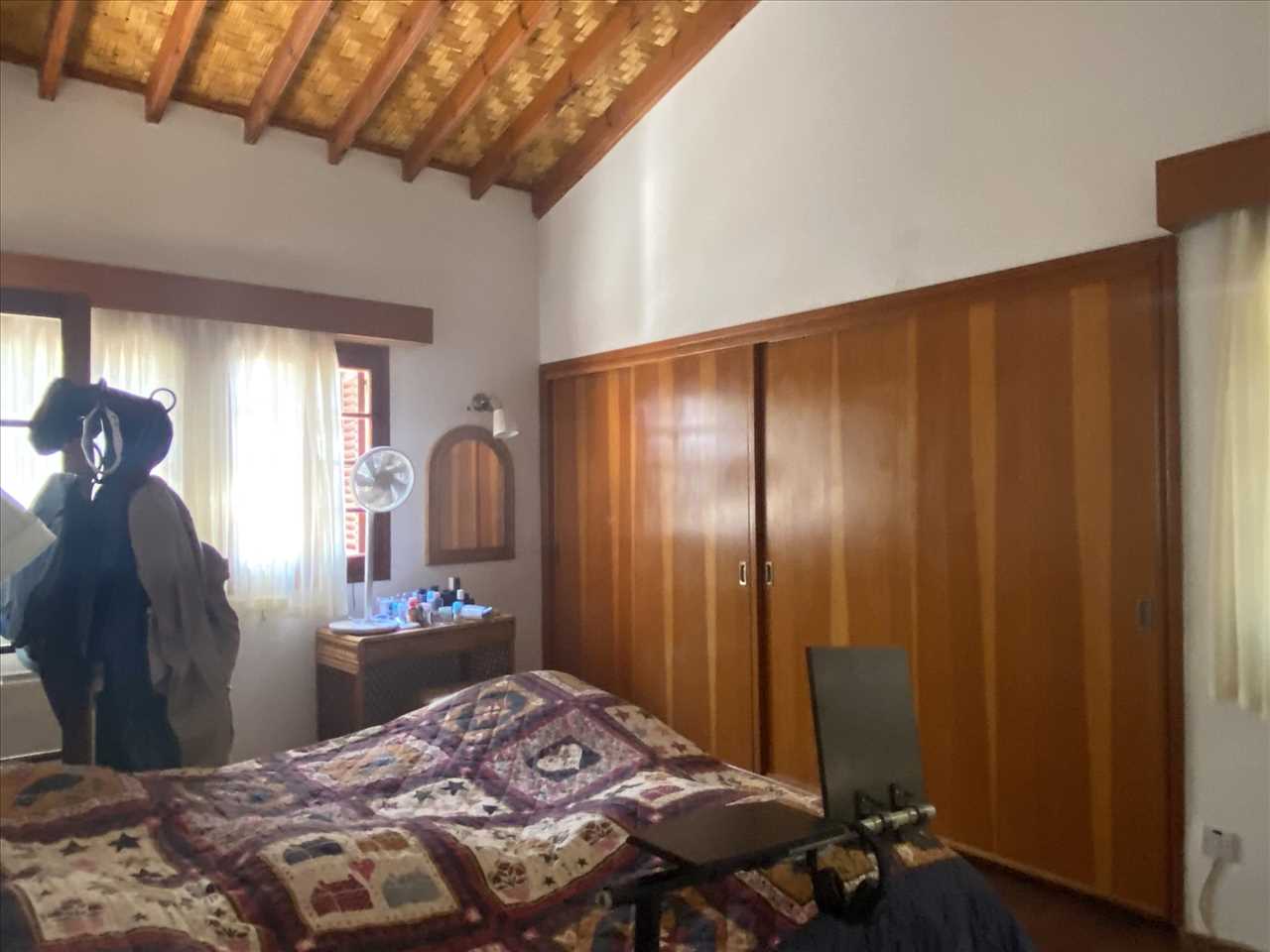 Dual aspect, open fireplace, beamed ceiling with central ceiling fan.