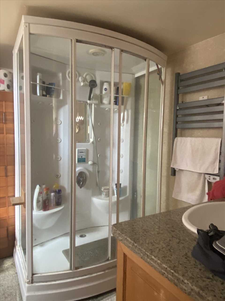 Single aspect, marble floor, wc, washbasin in marble topped vanity and enclosed multi jet shower.