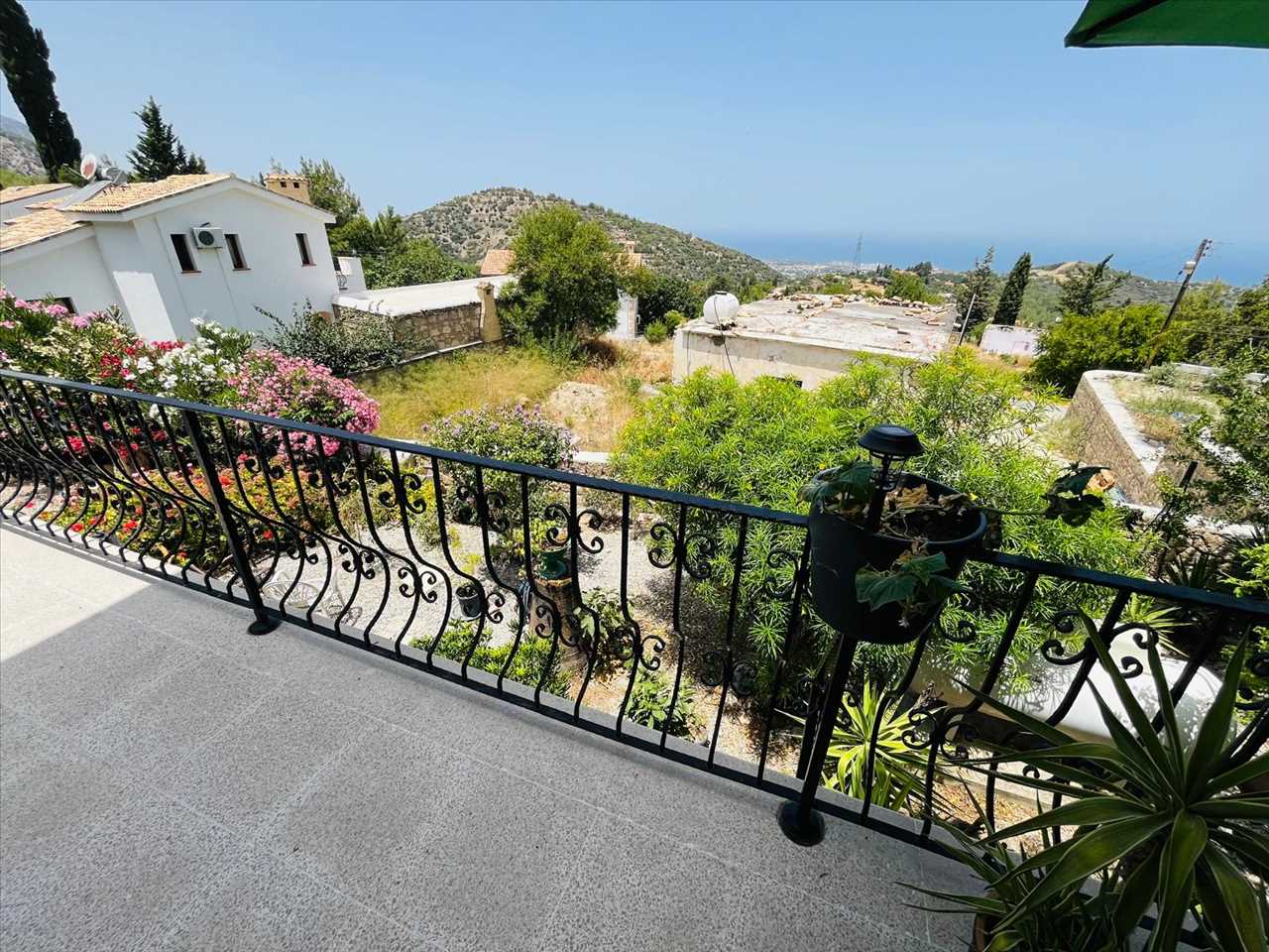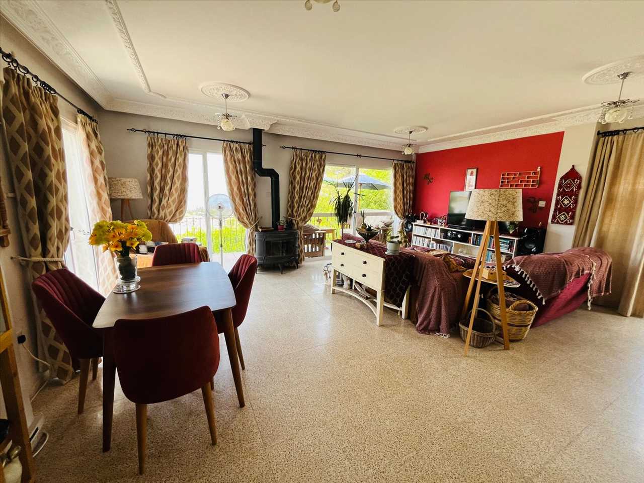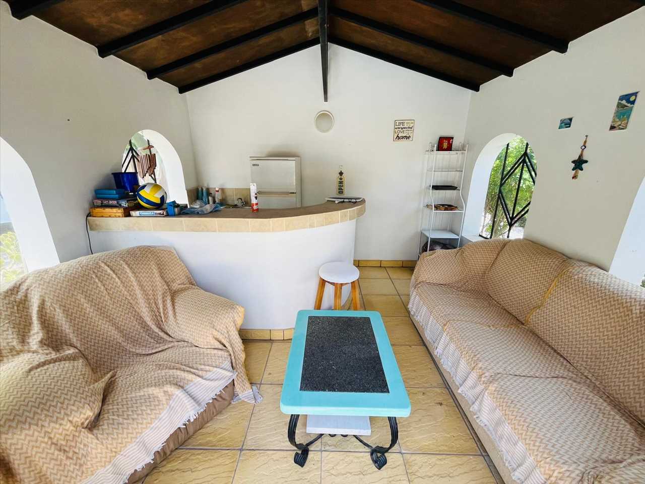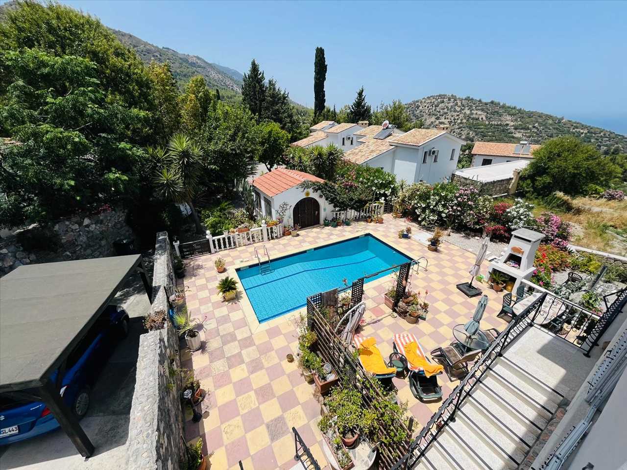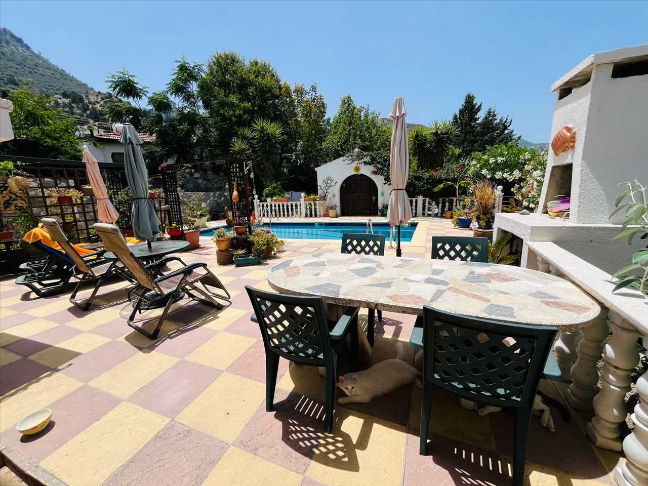 The property features spacious open plan living with an iron cast log burner in the lounge, fully fitted kitchen with a breakfast bar, spacious terraces, 3 bedrooms on the first floor, a self contained unit on the lower level with its own access, central heating throughout, ample outdoor seating area and an outdoor bar, private swimming pool, a beautiful garden with many mature (fruit) trees and absolutely stunning views to the sea and mountains. Individual deed in vendors name, house registered and exchange title.