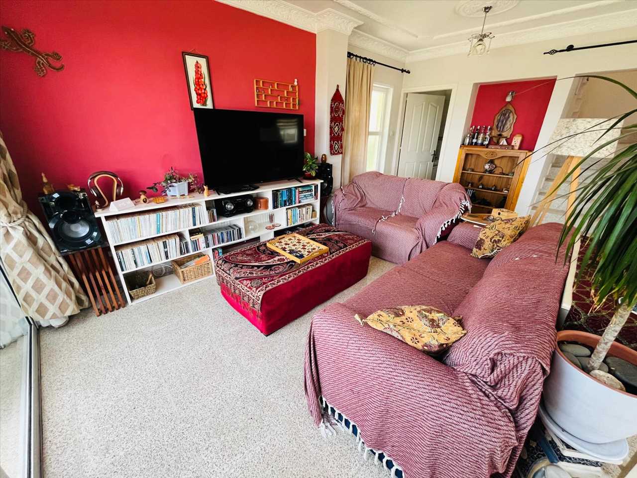 Triple aspect spacious lounge with coved ceilings, a log burner, central heating and sliding doors that lead out onto terrace with stunning views to the sea.