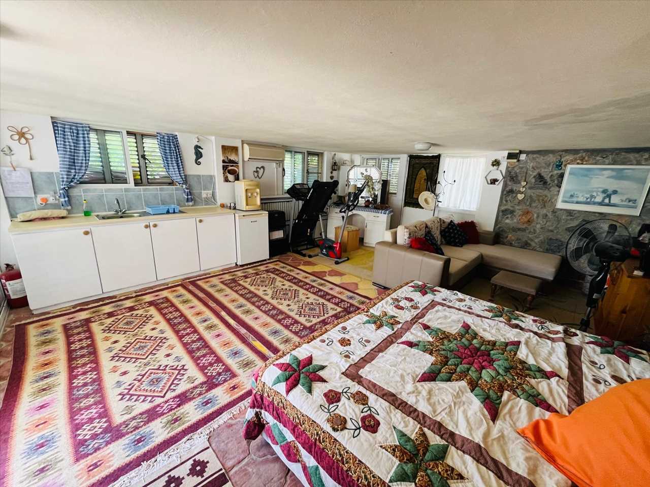 Open plan living in the self contained unit with a small kitchen with fitted cupboards and air conditioning.