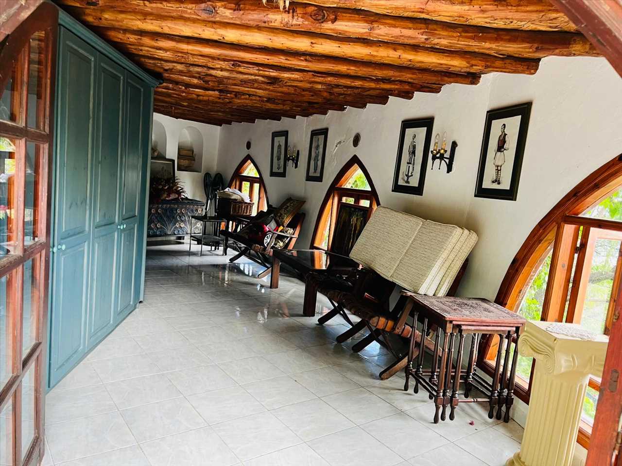Single aspect spacious guest room currently being used as a storage room with fitted wardrobes, ceramic tiles, beamed ceilings and beautiful arched windows.