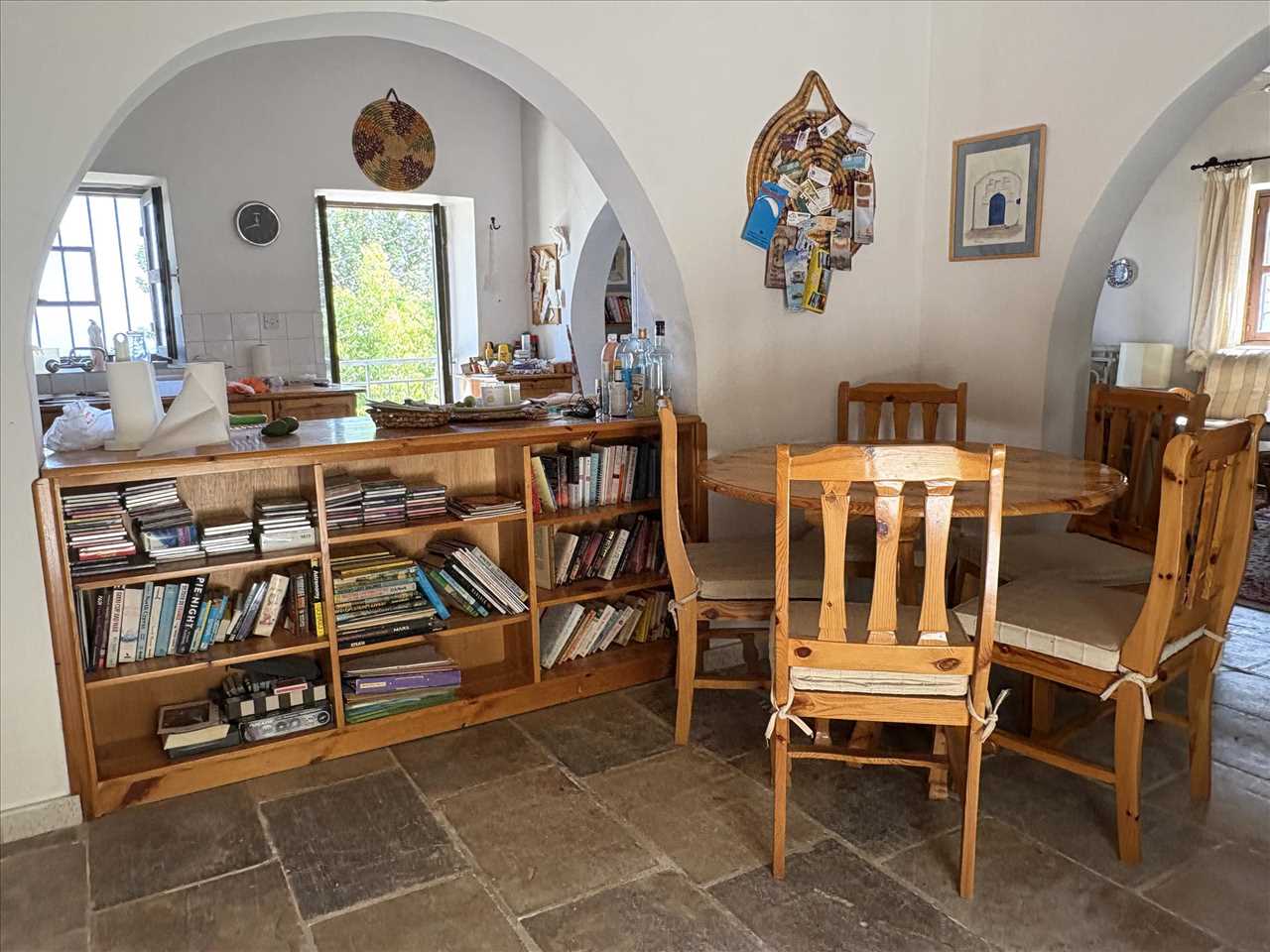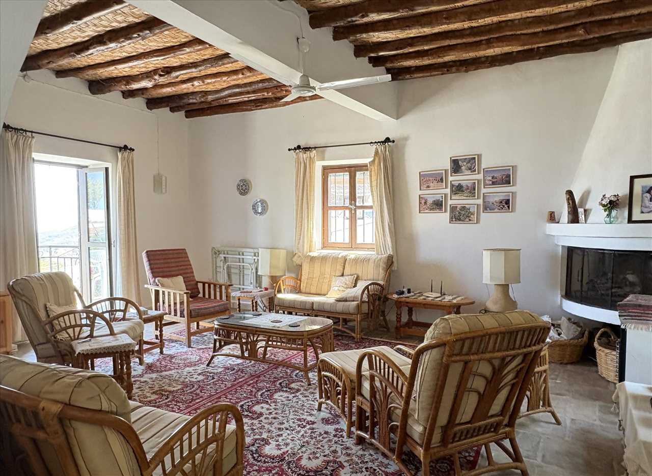 Huge lounge with triple aspect, stone floor, beam and mat ceiling, open fireplace, French doors to balcony and arch leading into the kitchen.