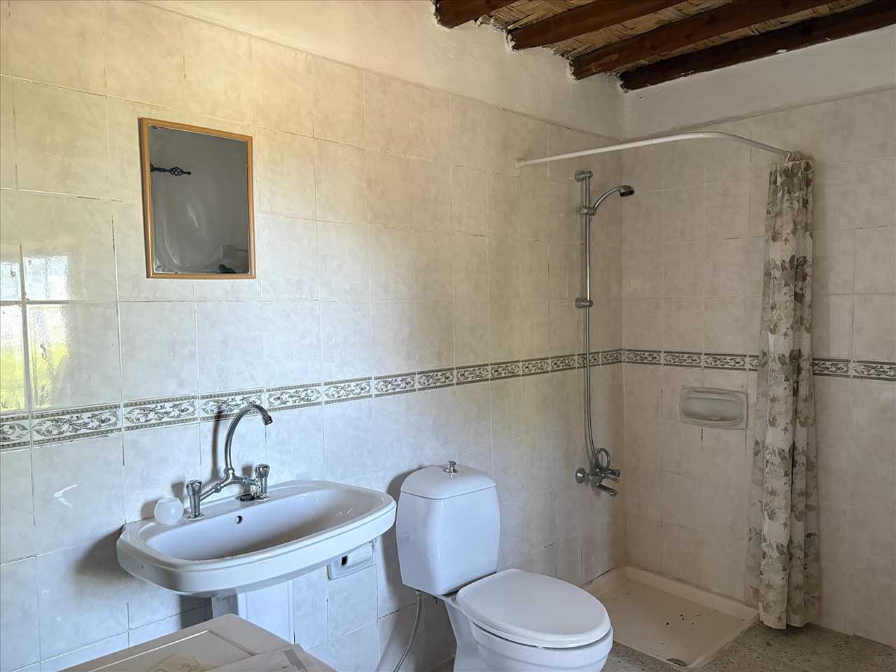 Single aspect, mosaic floor, beam and mat ceiling, wash basin, wc and shower.