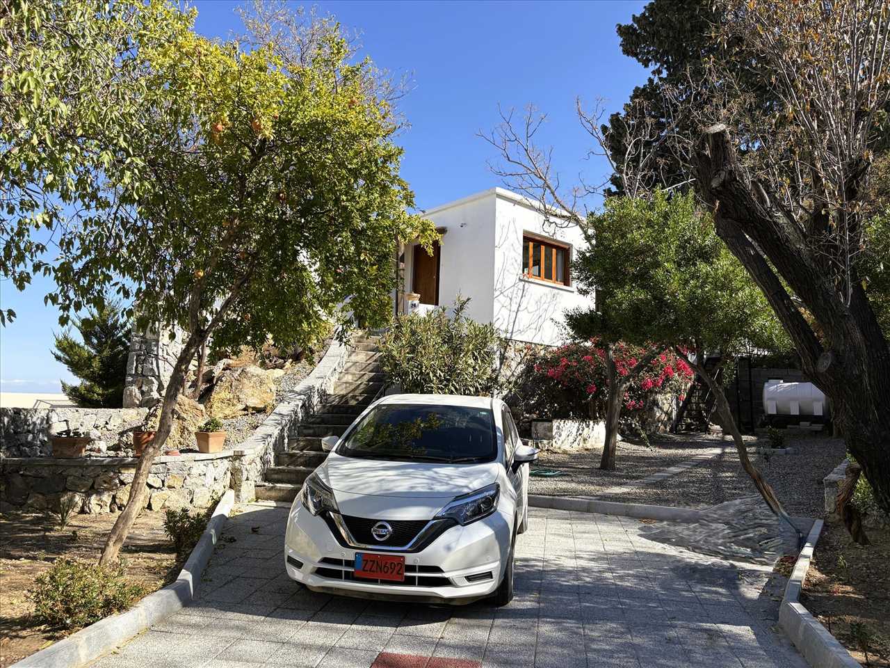 Gated entrance leads into the fully enclosed garden with large block paved parking area and steps leading up to the house.