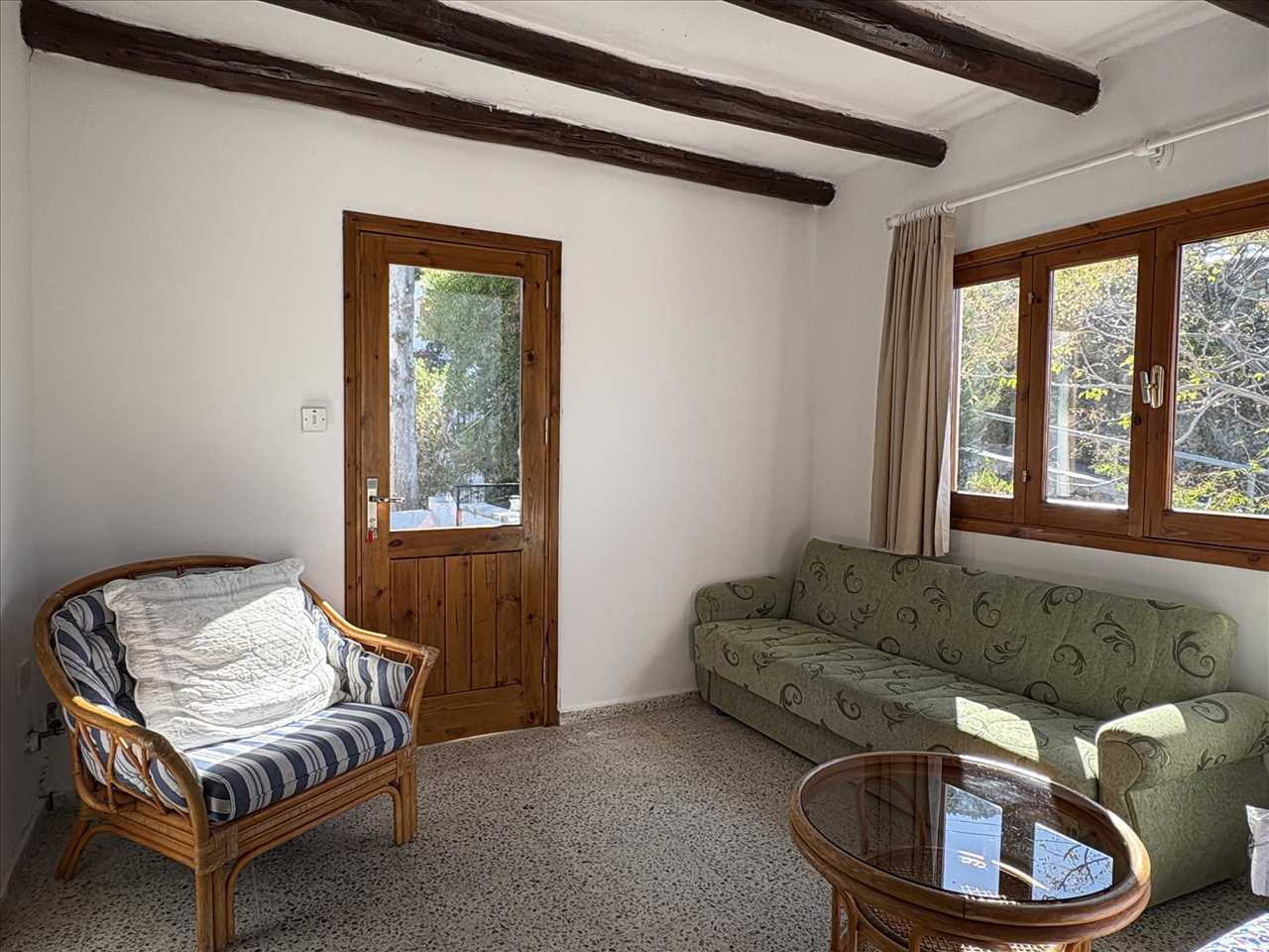 Dual aspect, mosaic floor, beamed ceiling, open plan into the kitchen area and French doors leading out to a huge terrace.