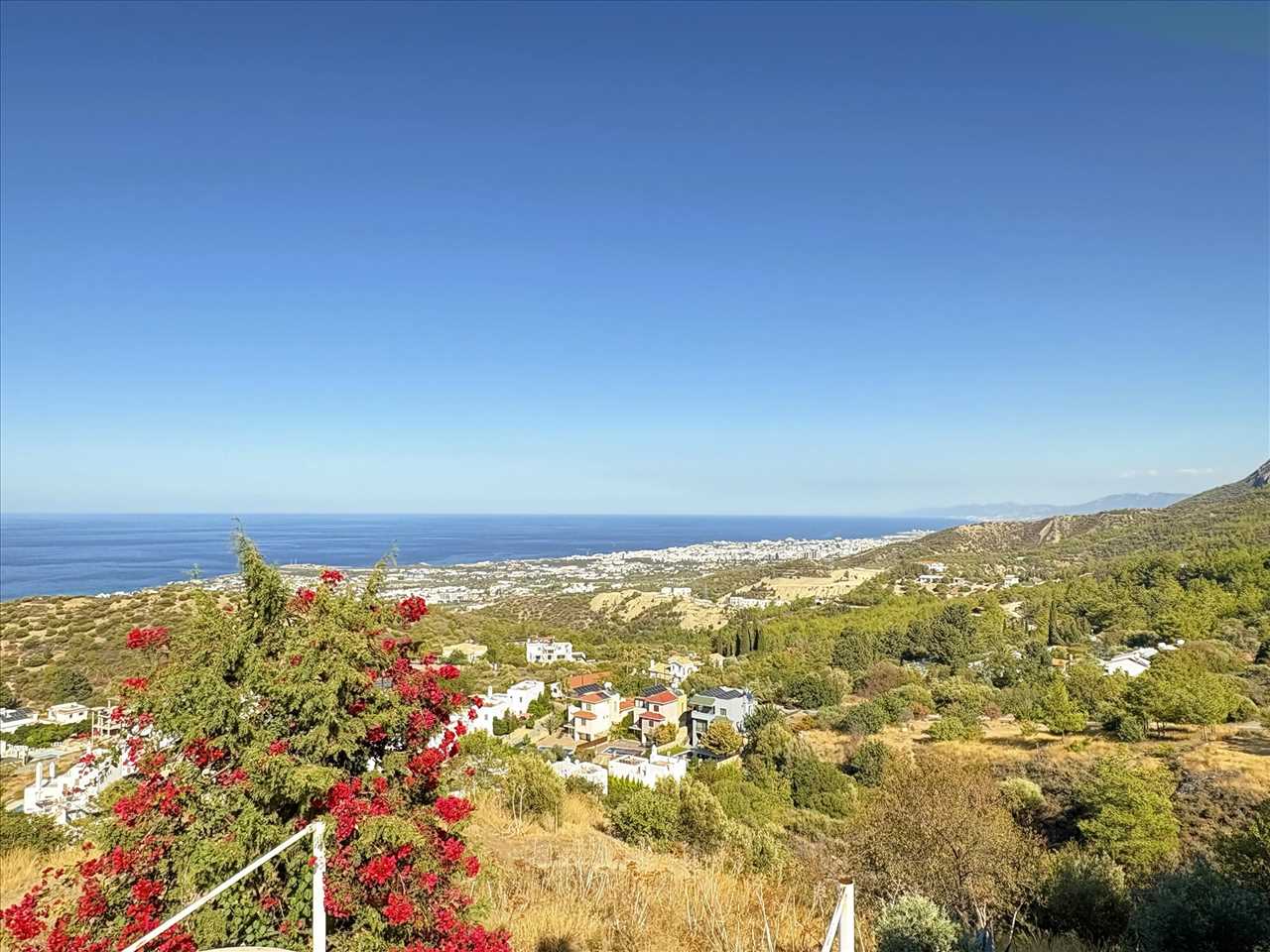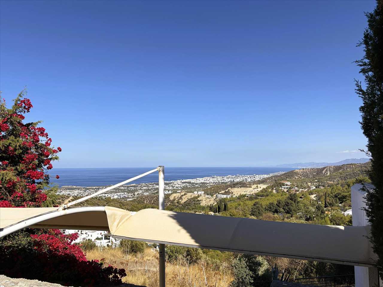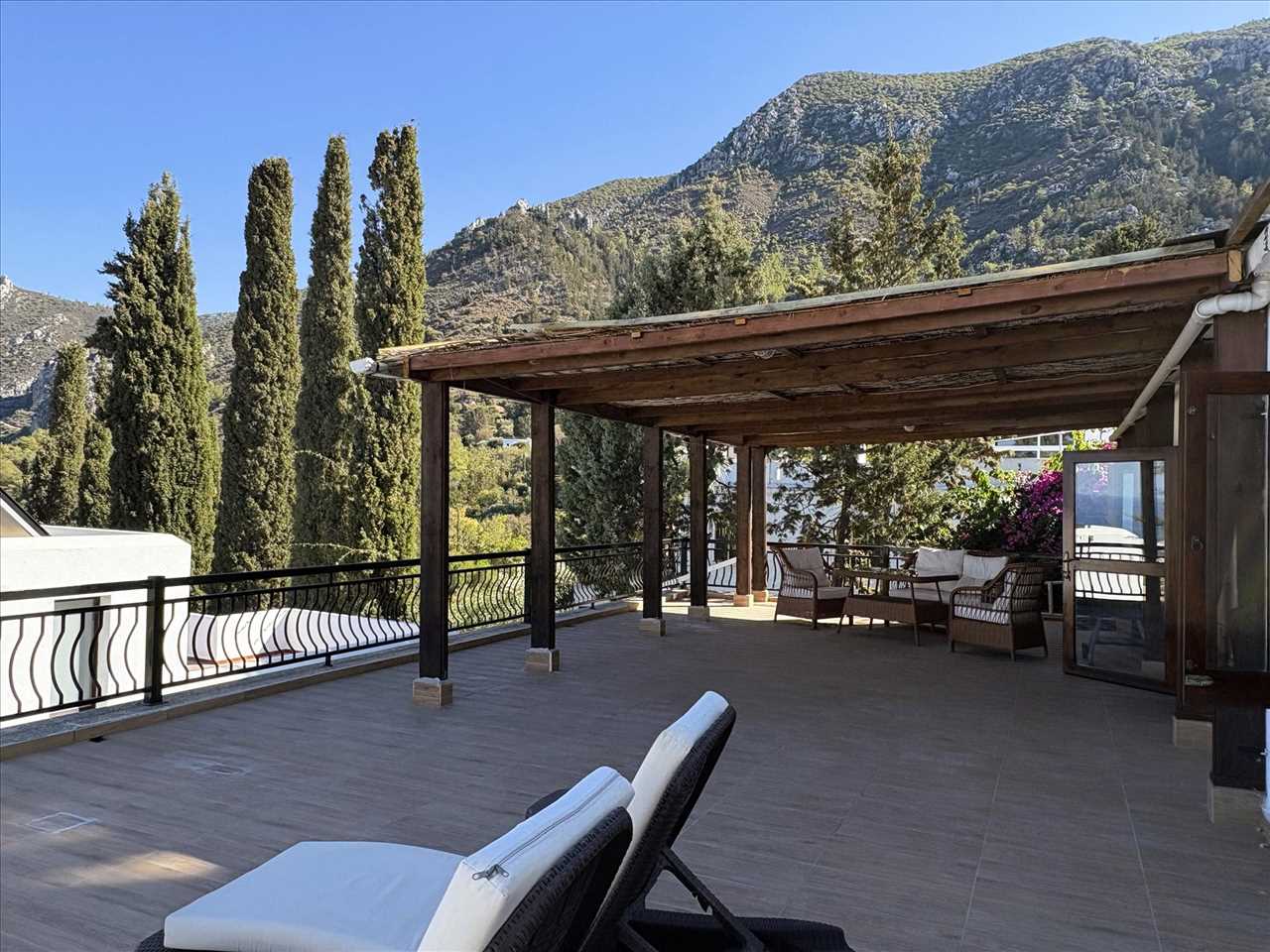Huge terrace with large pergola covered seating area and spectacular views to the mountain range and coast.