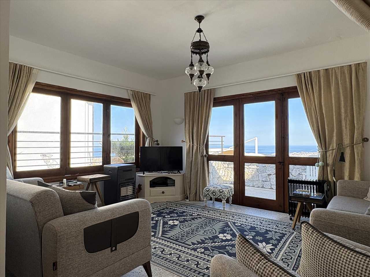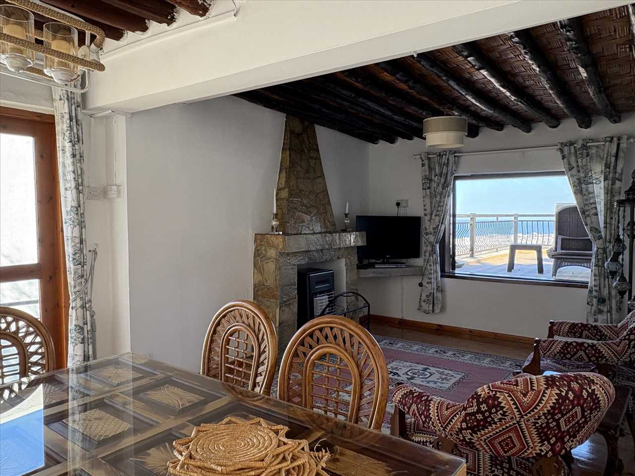 Dual aspect, timber floor, beamed ceiling, stone open fireplace, French doors leading out to terrace and a picture window that takes in the beautiful views.