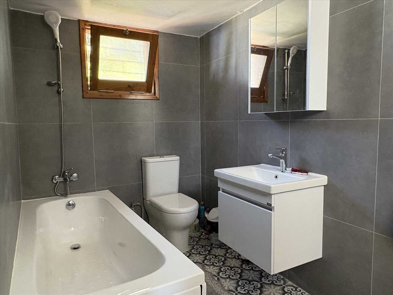 Newly fitted bathroom with single aspect, ceramic floor and wall tiles, wc, washbasin in vanity unit and bath with overhead shower and glass screen.