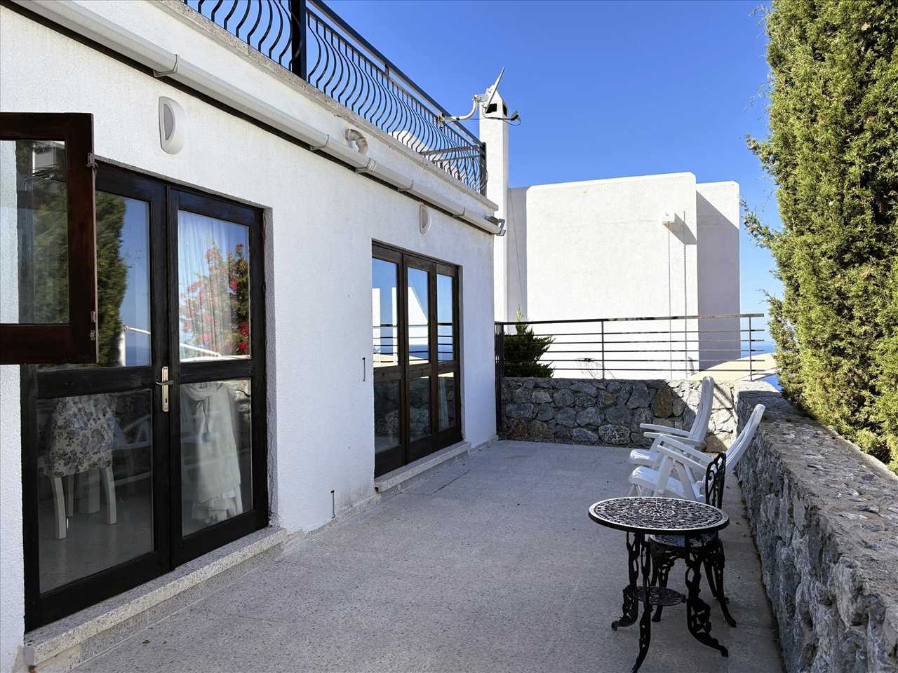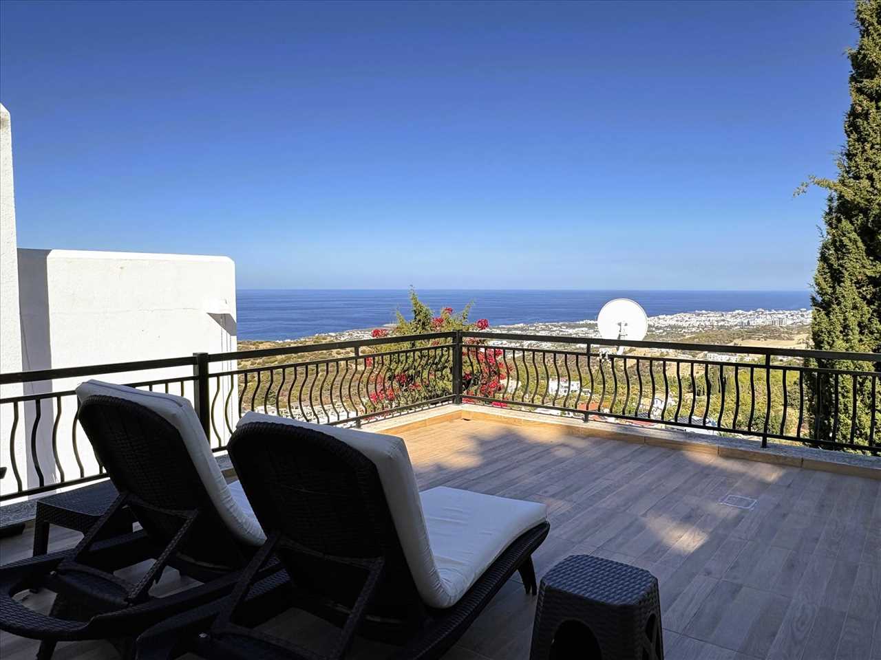 Private terrace with ample space for dining and seating and a beautiful view to the coast.