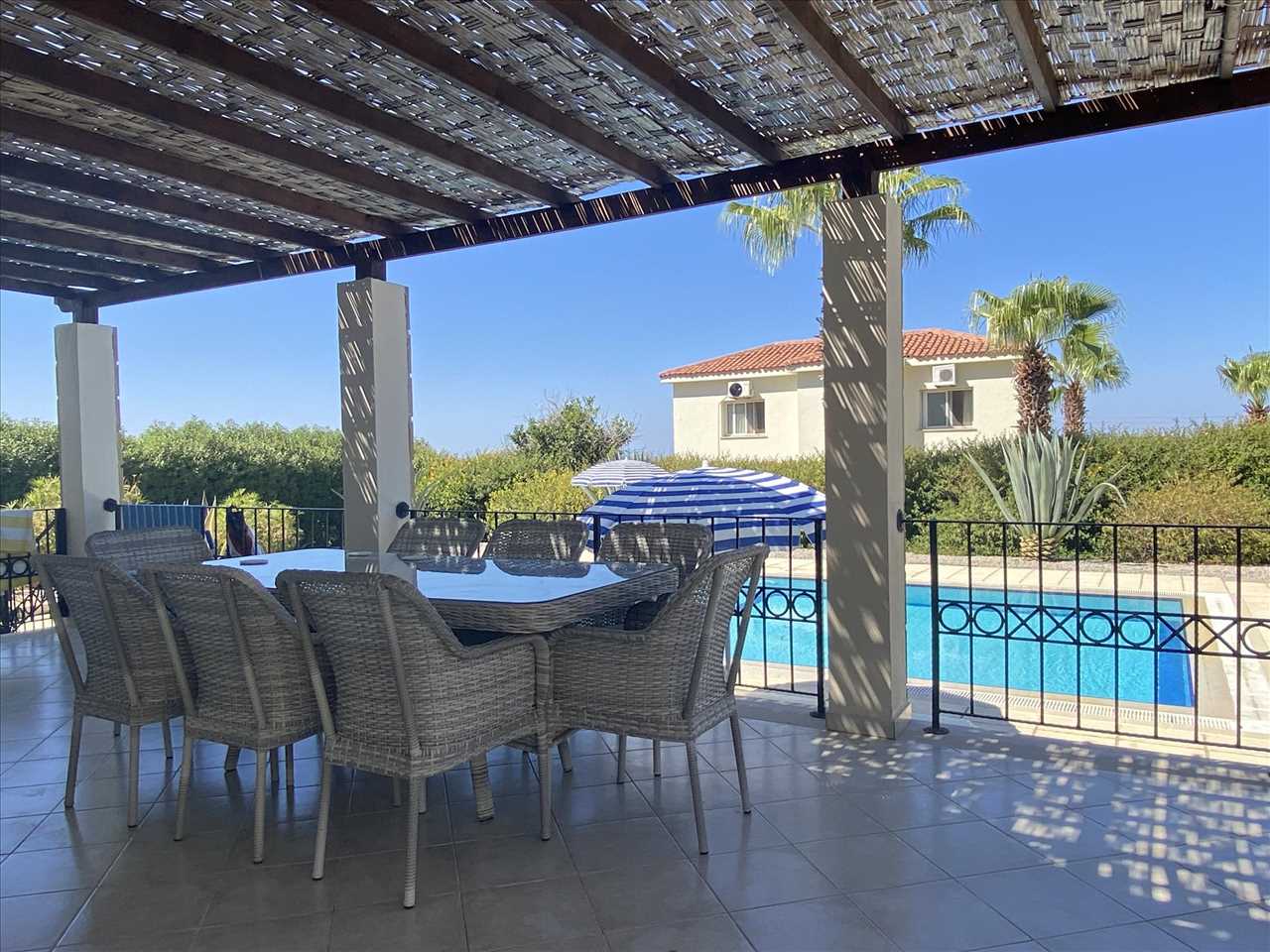 Large covered terrace overlooking the pool and offering ample space for dining and seating.