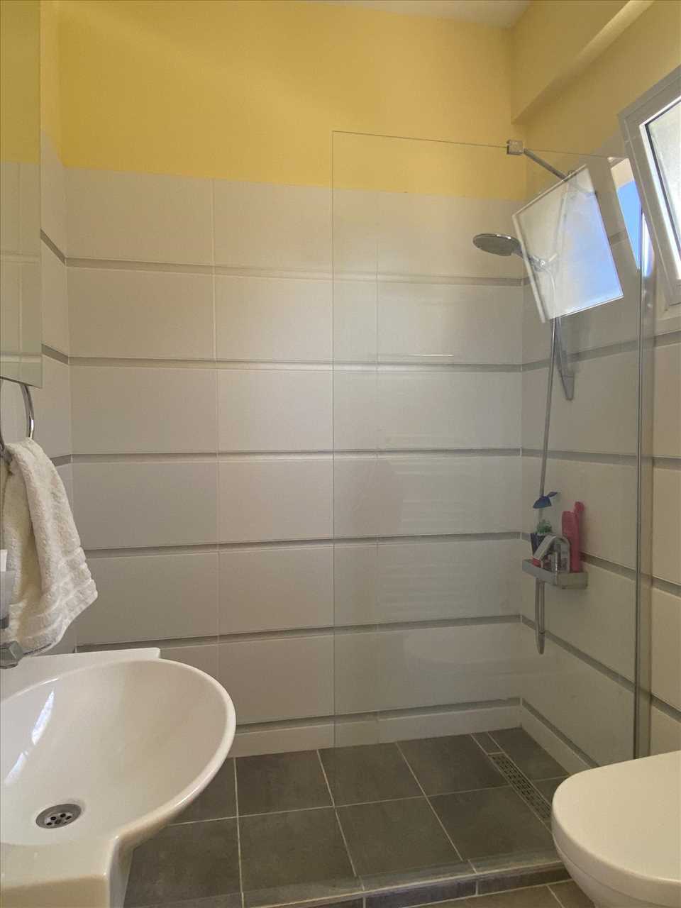 Single aspect, ceramic floor and wall tiles, wall mounted wc, washbasin and shower with glass screen.