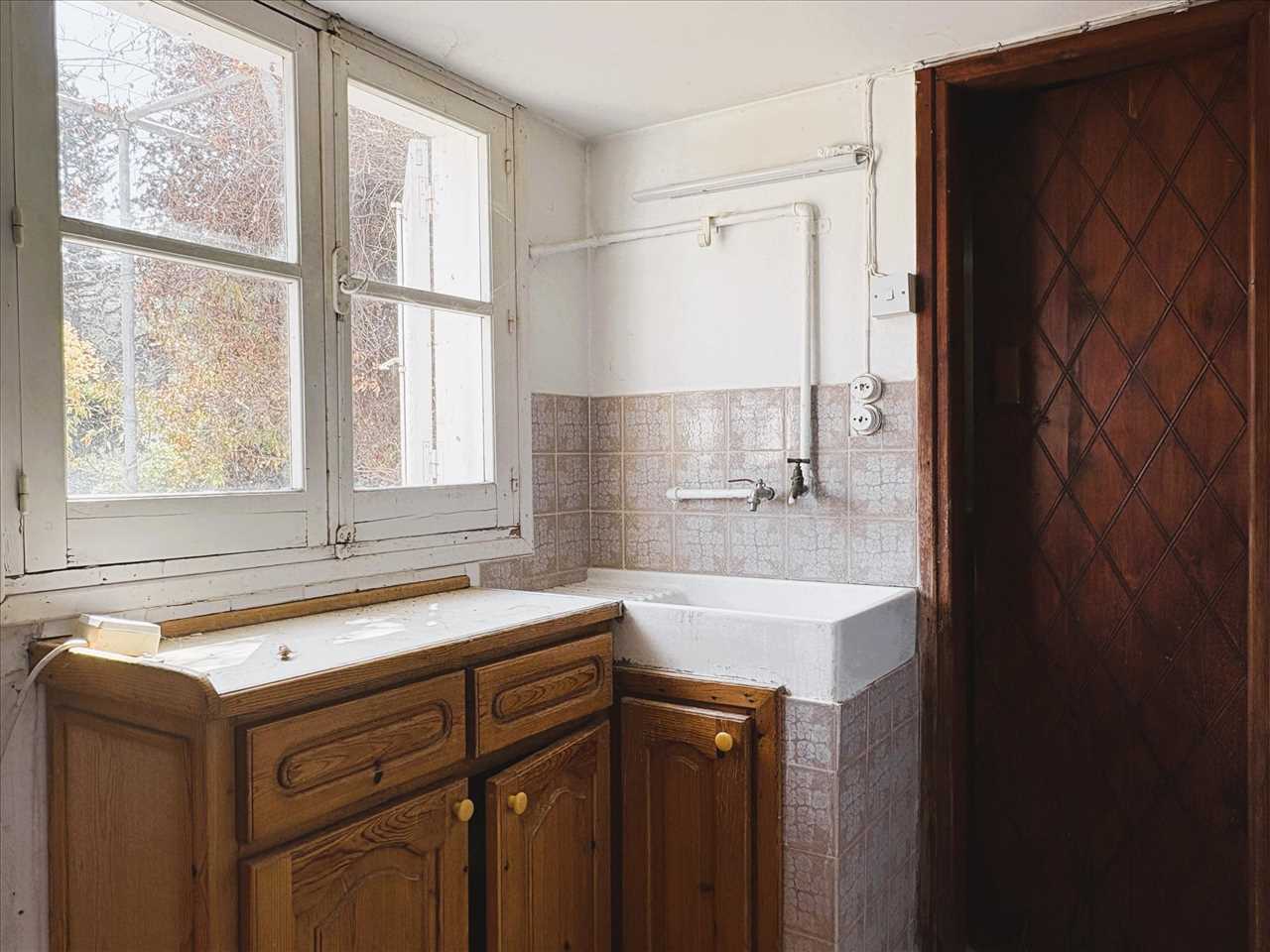 Single aspect, mosaic floor, timber kitchen units and sink.