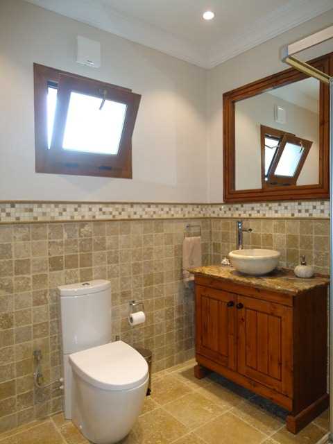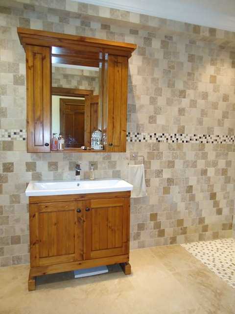 Single aspect, travertine floor and walls, coved ceiling with spotlights, large storage cupboard, heated towel rail, under floor central heating, extractor fan, wc, washbasin in vanity unit and bathtub.