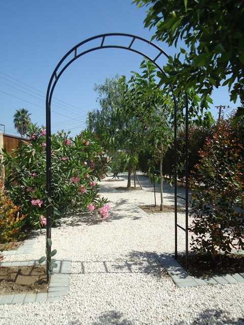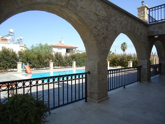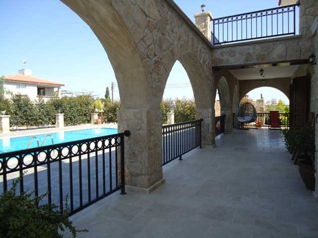 Large covered terrace with stone arches, storage cupboard, electric points and views overlooking the pool.
