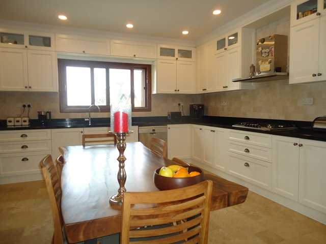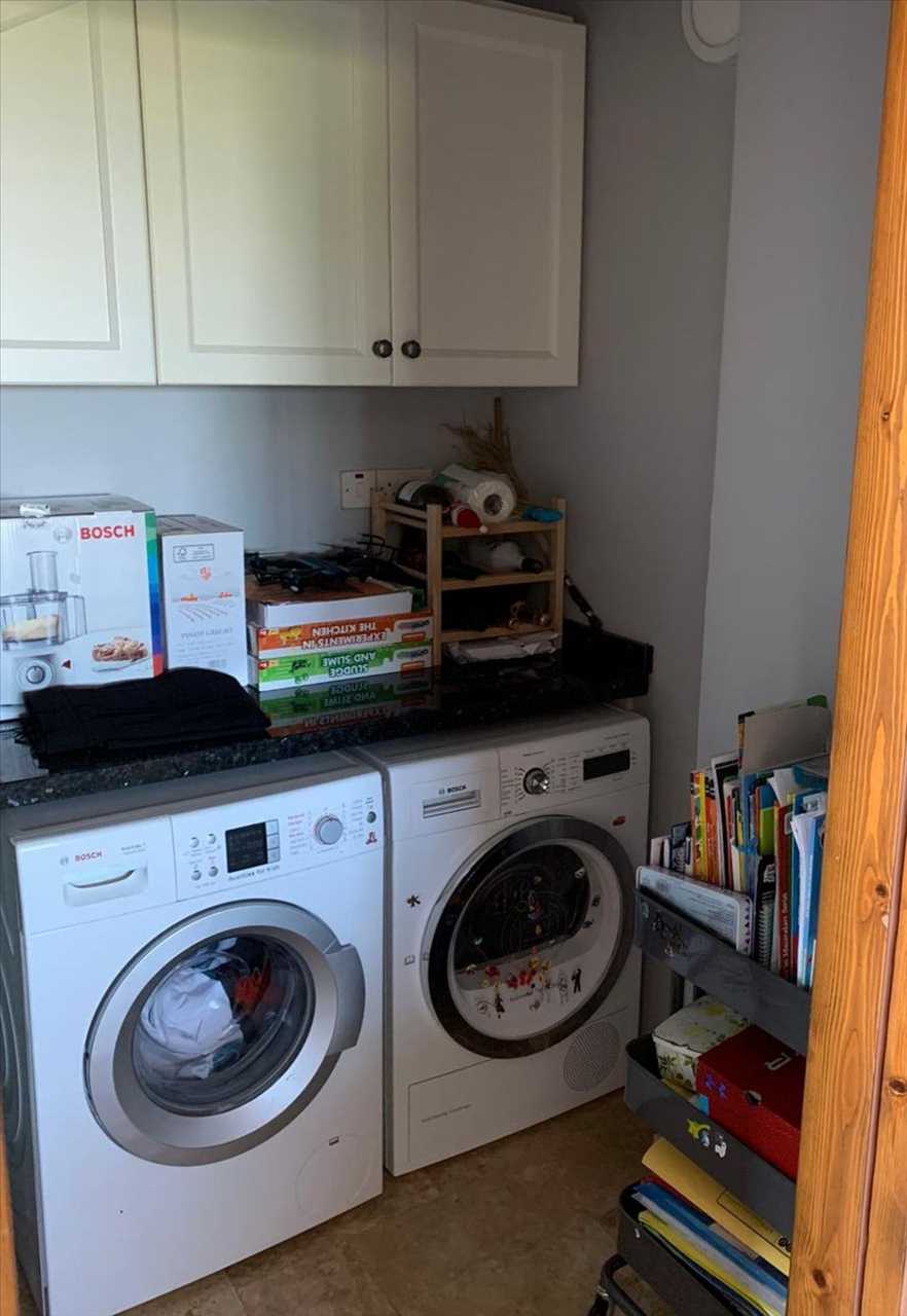 Travertine floor, fitted kitchen units with granite tiled work tops and splash back, washing machine, tumble dryer and lots of space for storage.