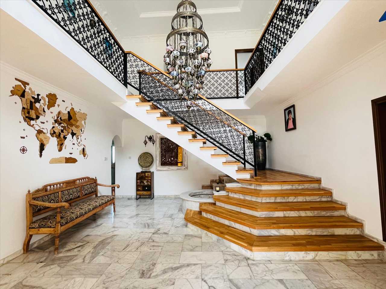 Double wooden doors into Grand entrance hall with wooden staircase and galleried landing, marble floors, water feature and central chandelier