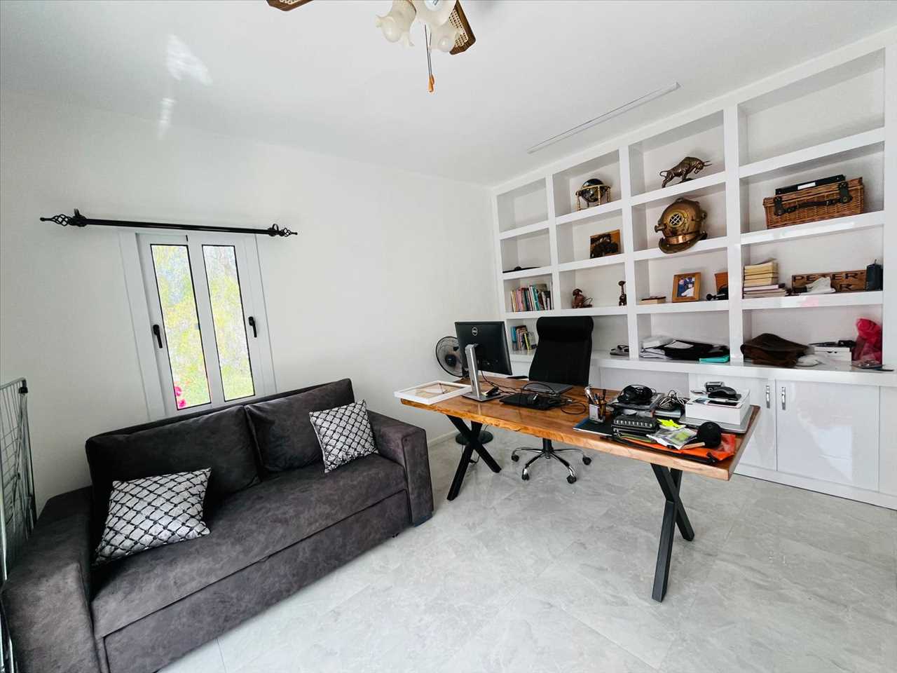 Dual aspect study with marble floors, ceiling fan, fitted cupboards and sliding doors onto south facing terrace