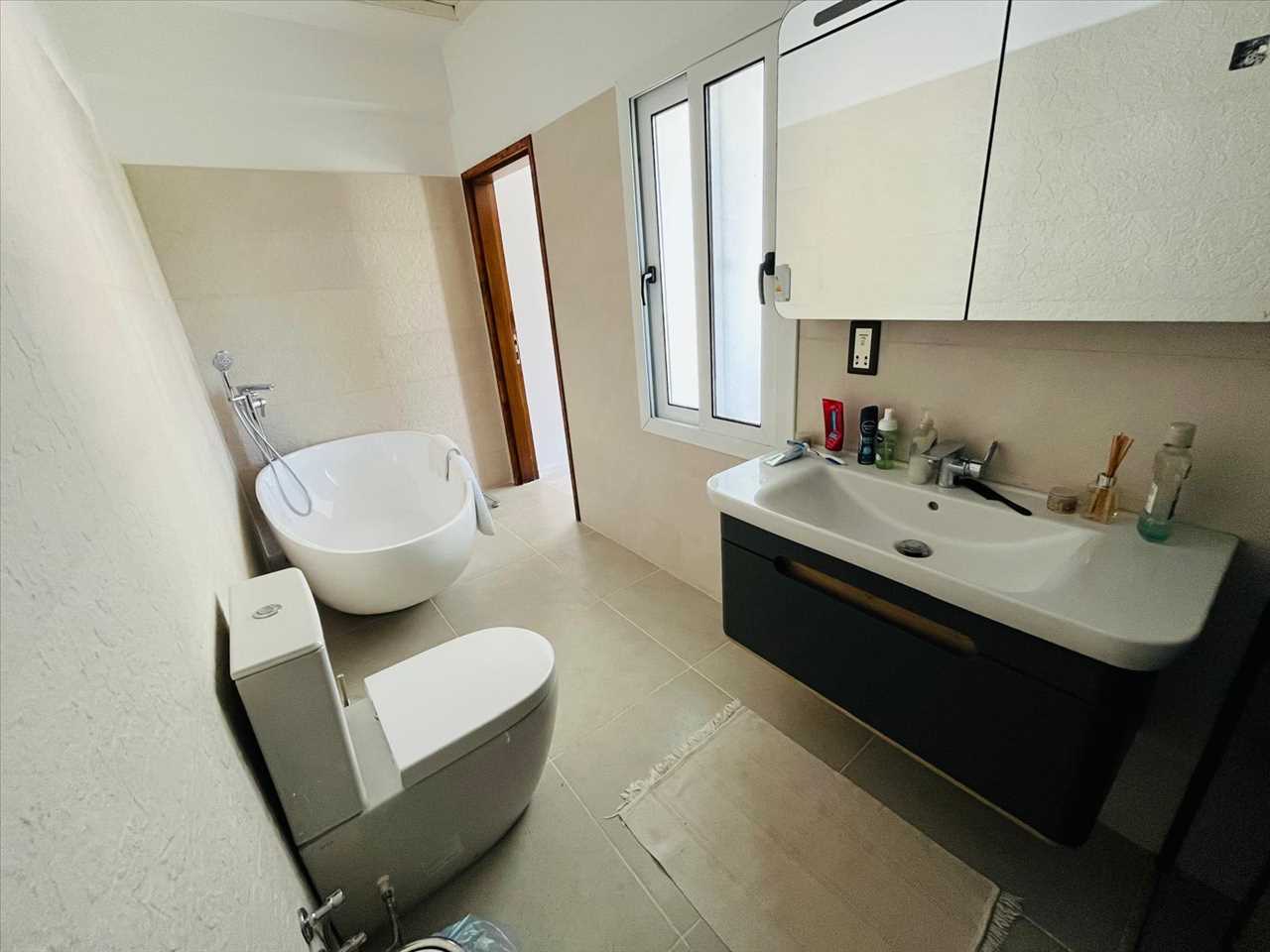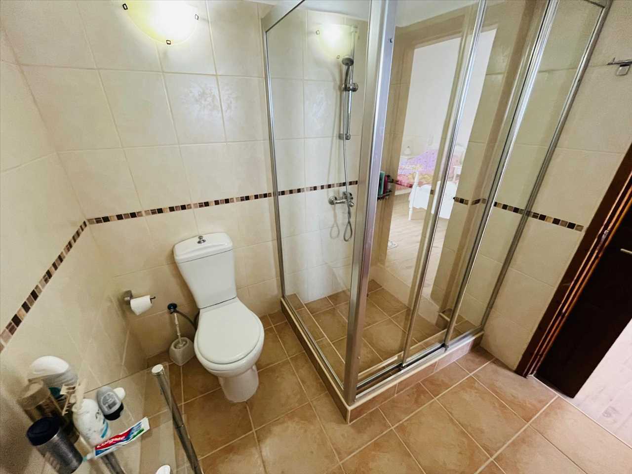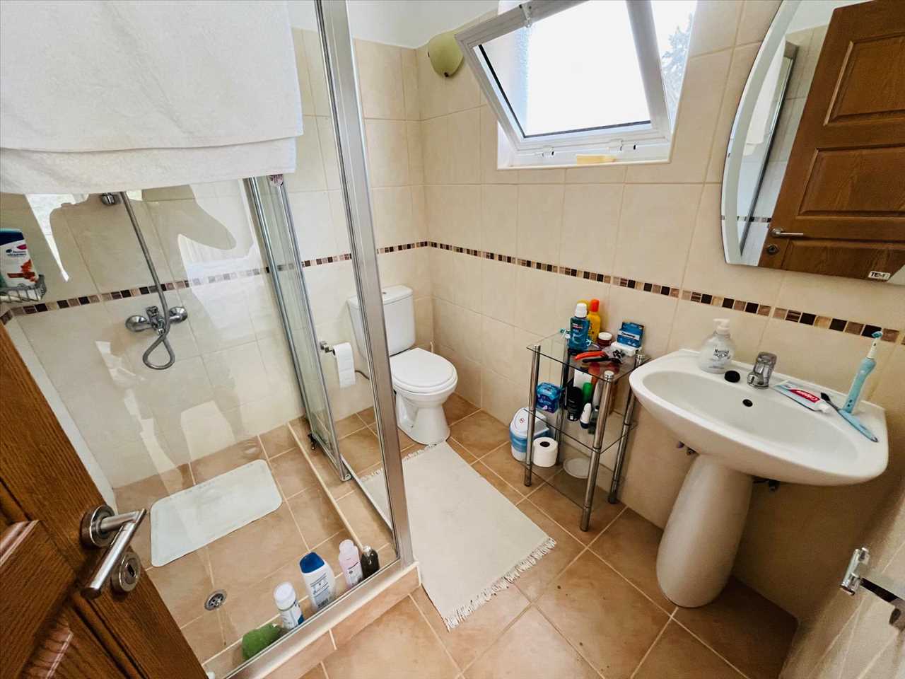 Single aspect with ceramic tiles, bath tub, walk-in shower, toilet and vanity unit.
