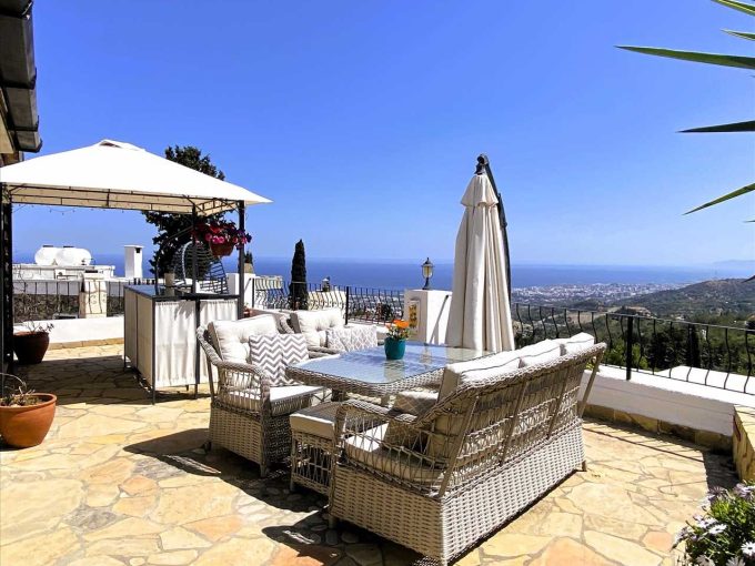 Wrought iron staircase from the entrance terrace leads up to the roof terrace which offers a lovely view to the mountains.