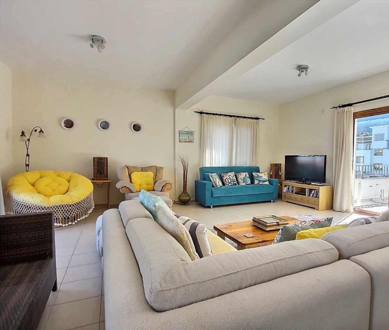 Triple aspect living area with L-shaped sofa, television, air conditioning and patio door access to front and rear balconies.