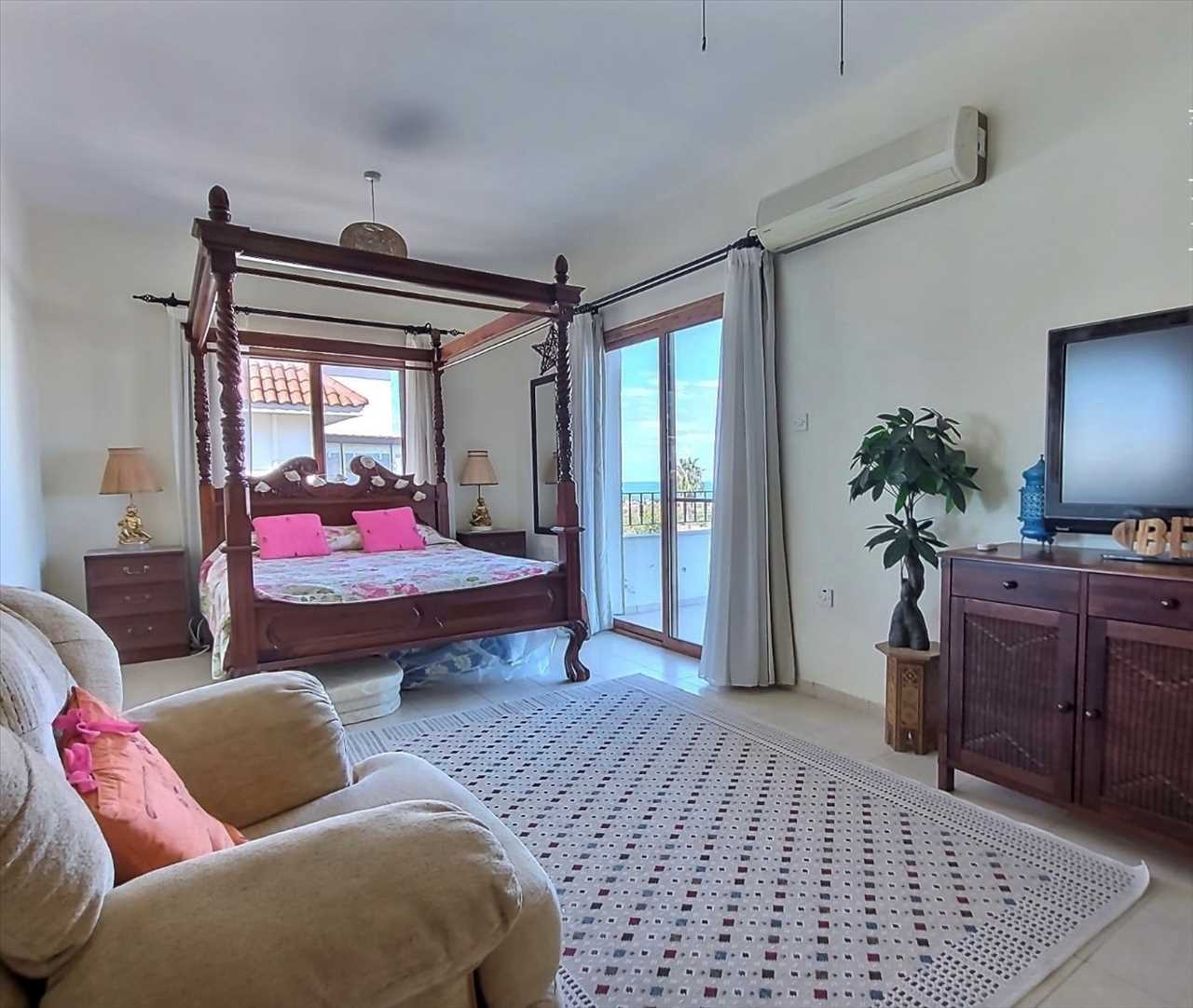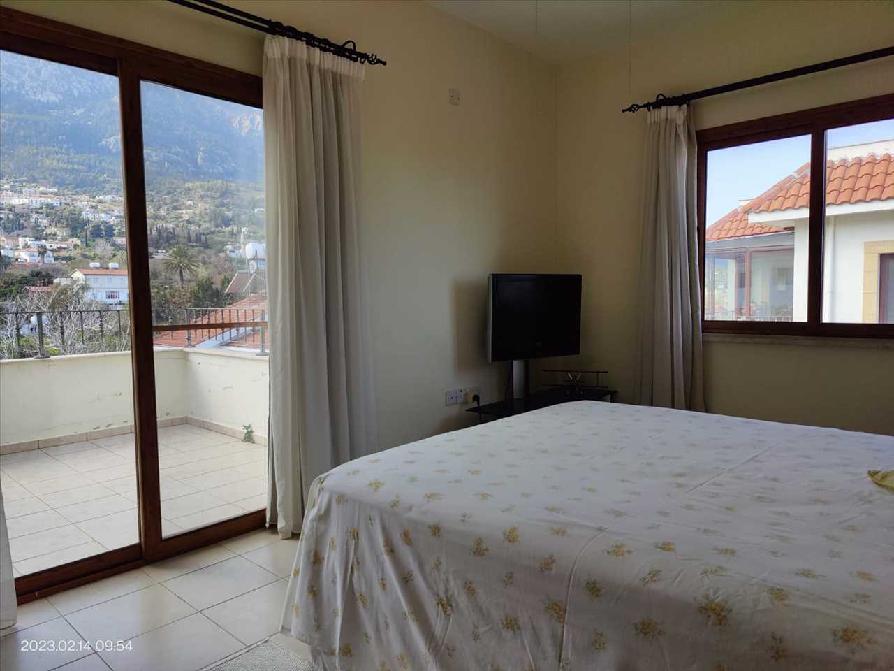 Dual aspect room equipped with double bed, built in wardrobes, ceiling fan and patio door to terrace