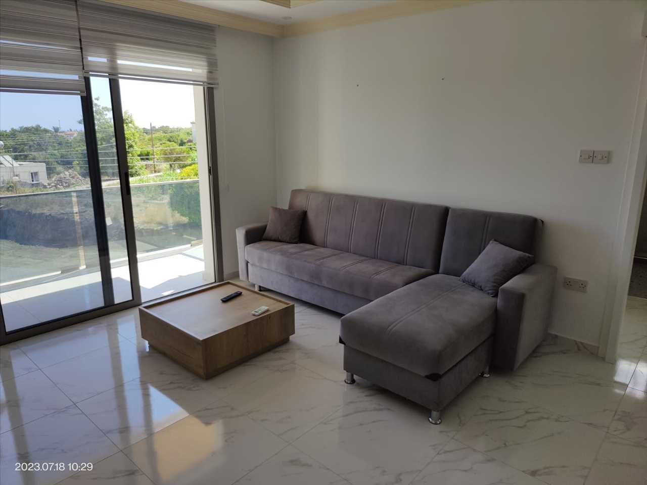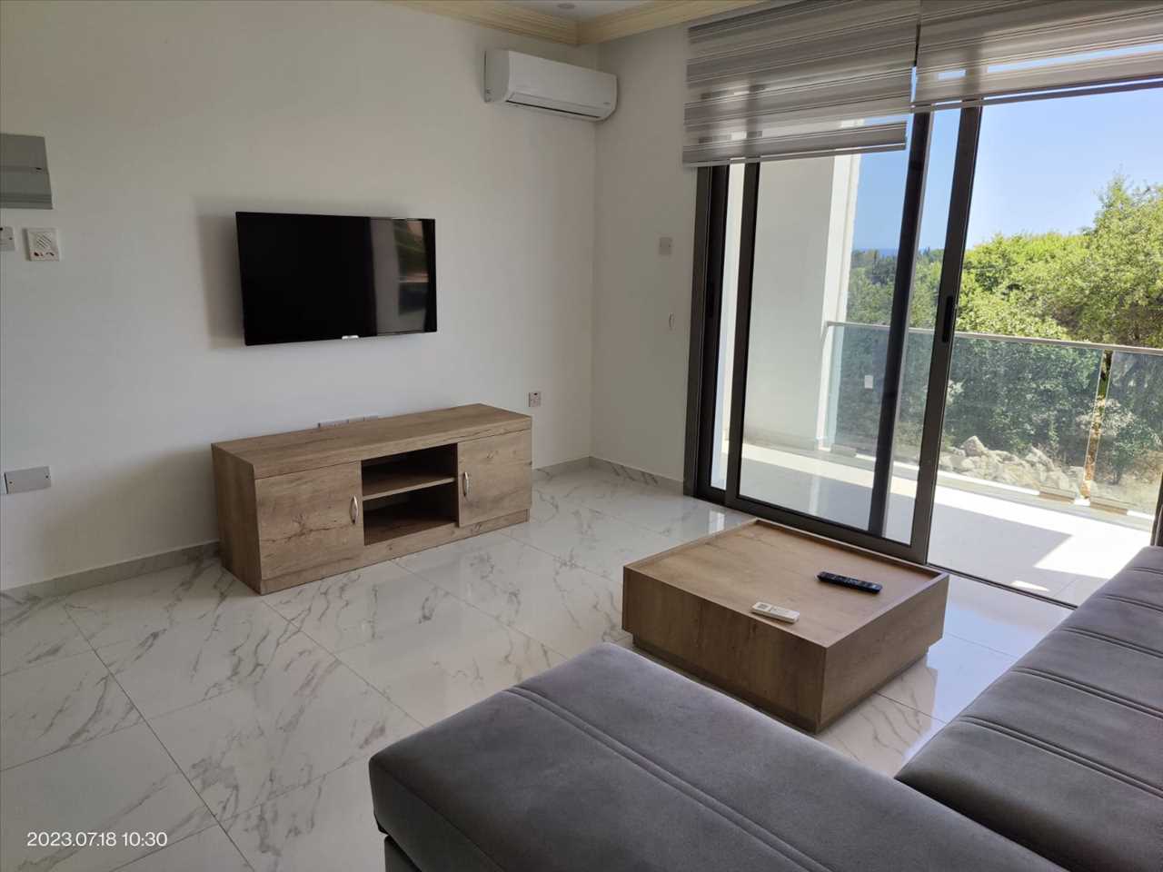 Dual aspect living area furnished with sofa, TV and air conditioning