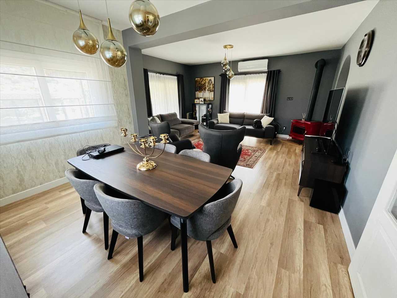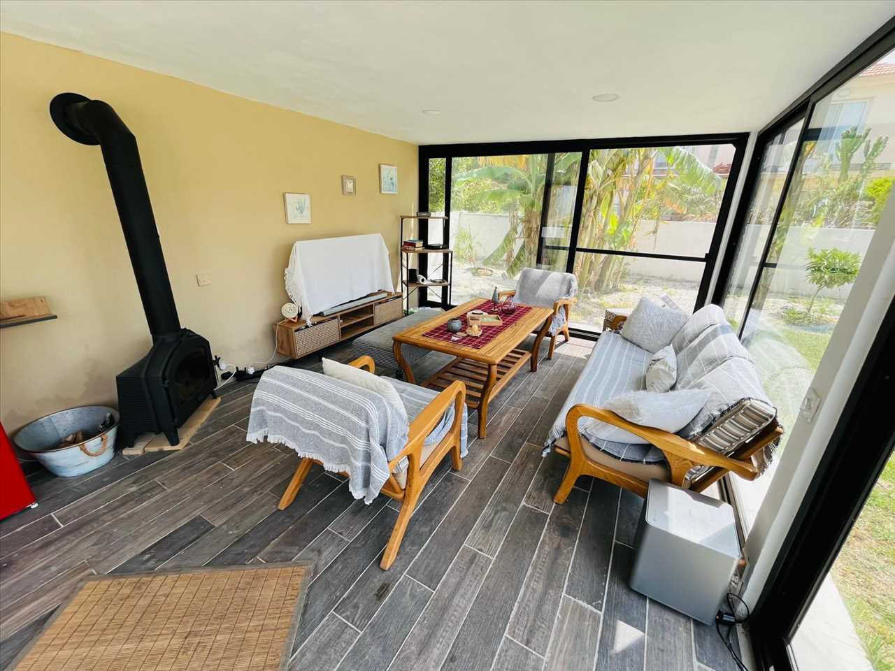 Triple aspect lounge with wooden laminate floors, log burner, air conditioning and sliding doors that lead out onto the covered back terrace.