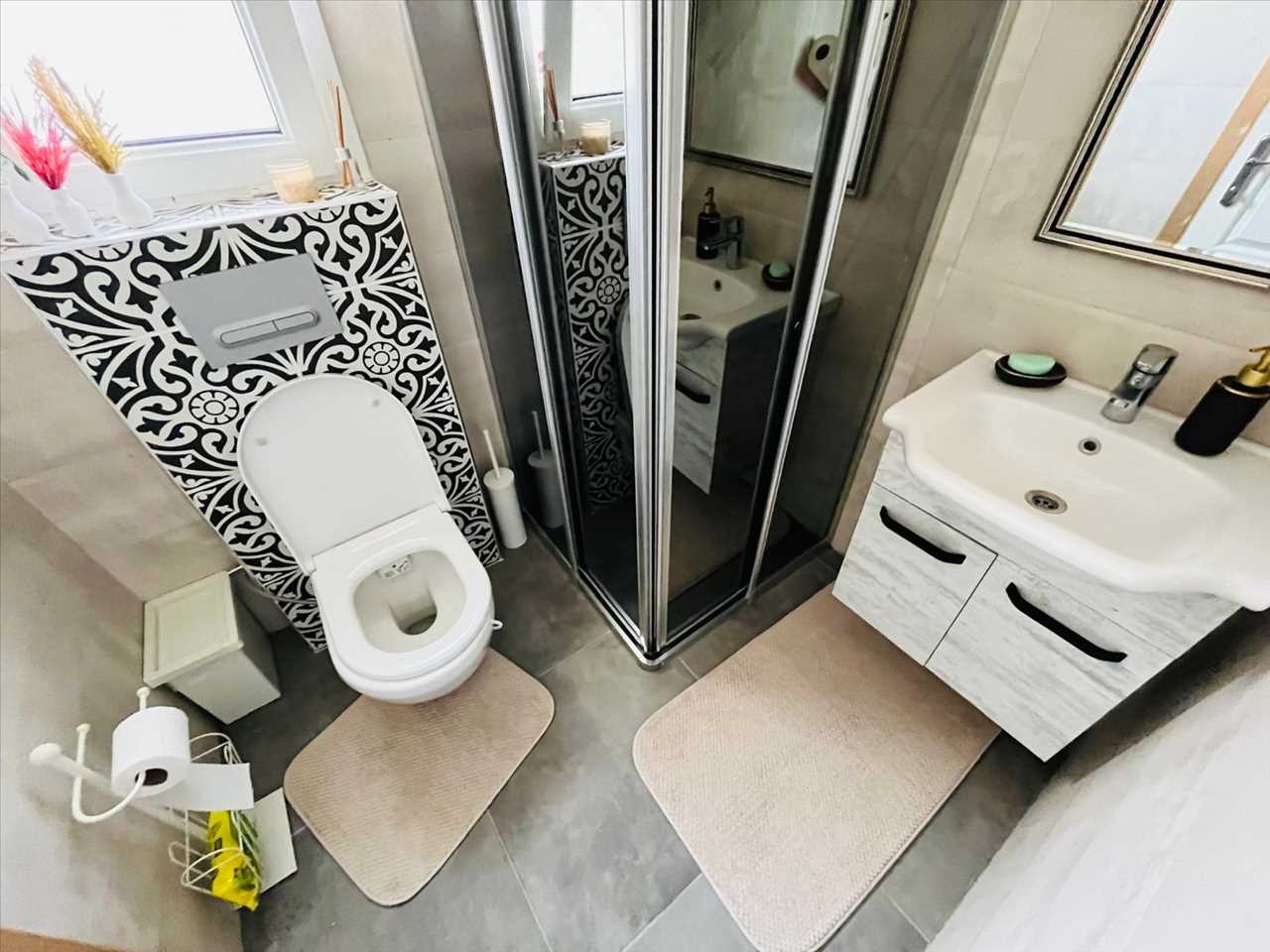 Single aspect bathroom with ceramic tiles, shower cabin, vanity unit and toilet located on the ground floor.