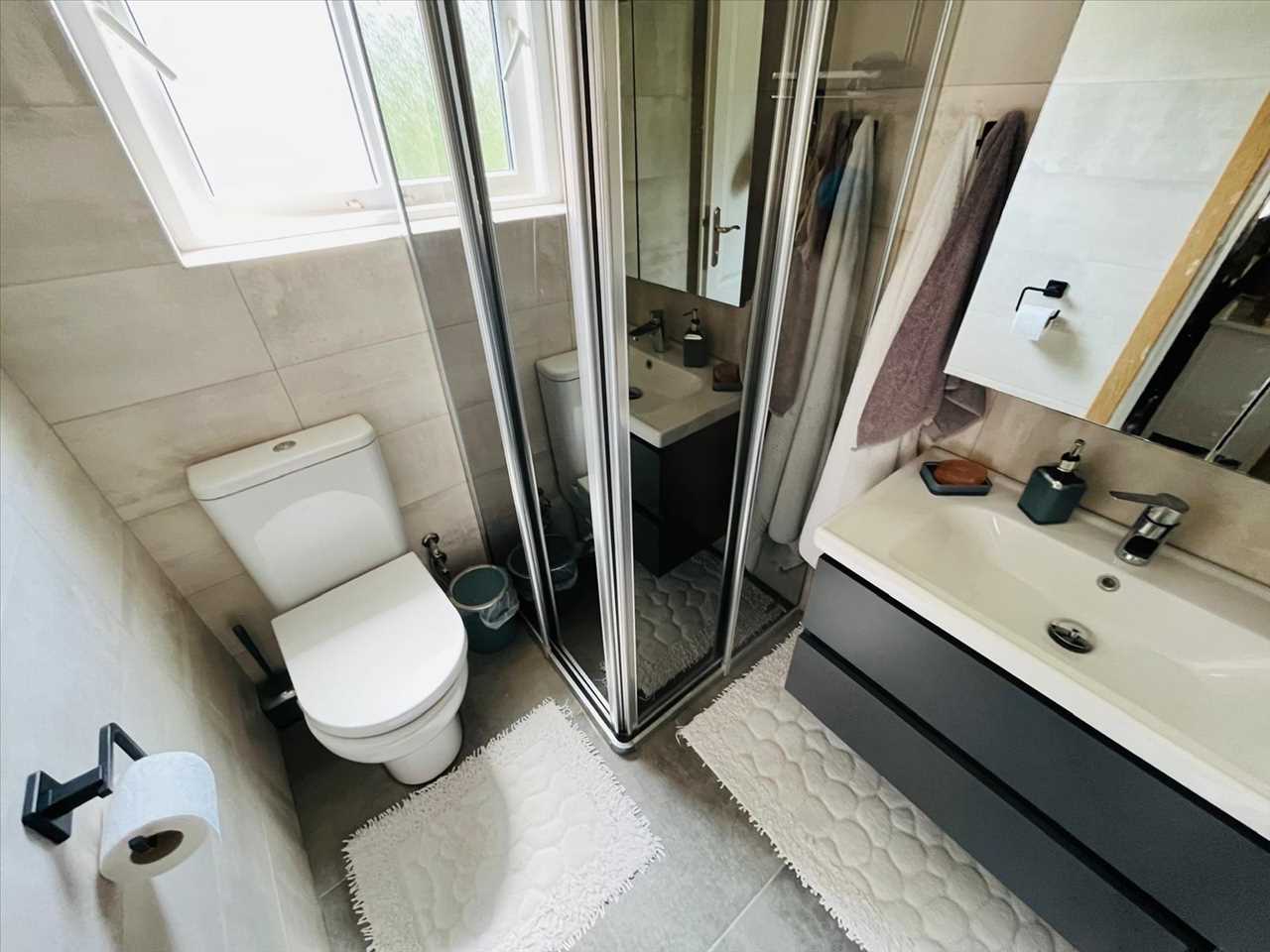 Single aspect en suite bathroom with ceramic tiles, shower cabin, vanity unit and toilet.