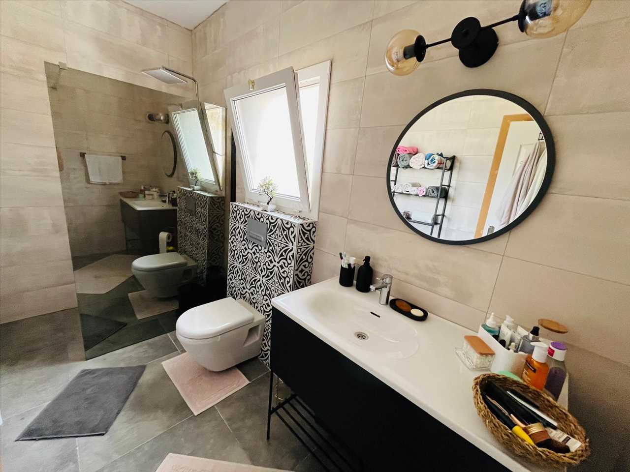 Single aspect family bathroom with ceramic tiles, walk in shower, large vanity unit and toilet.